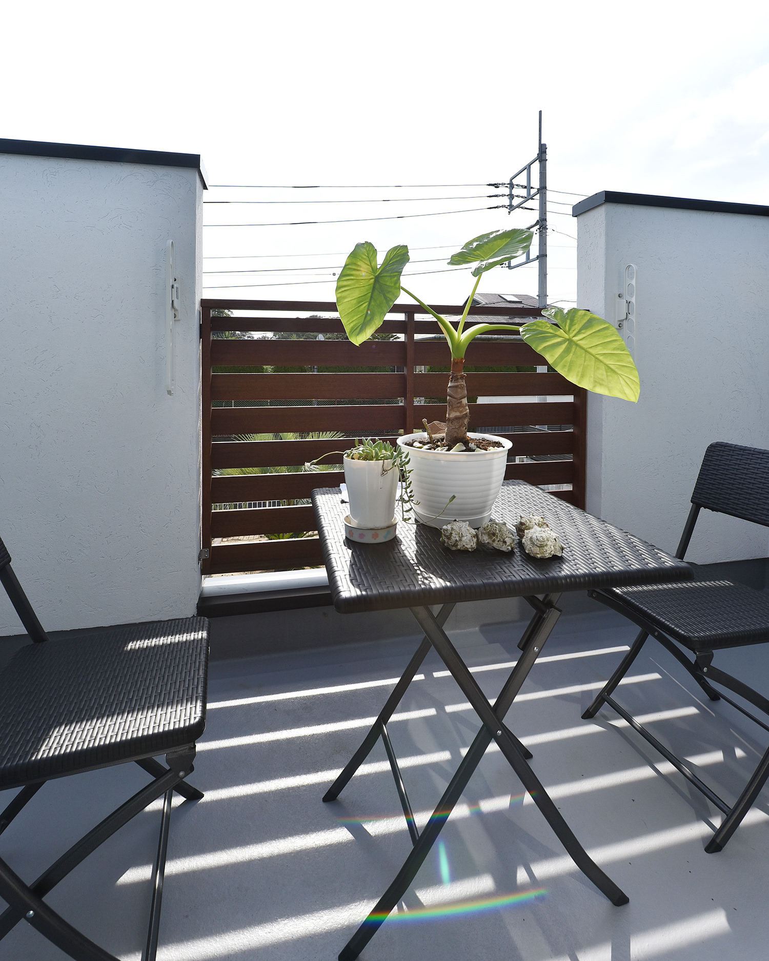 テラス手すりは外からの視線を遮りつつ、木部のスリットで通風も。