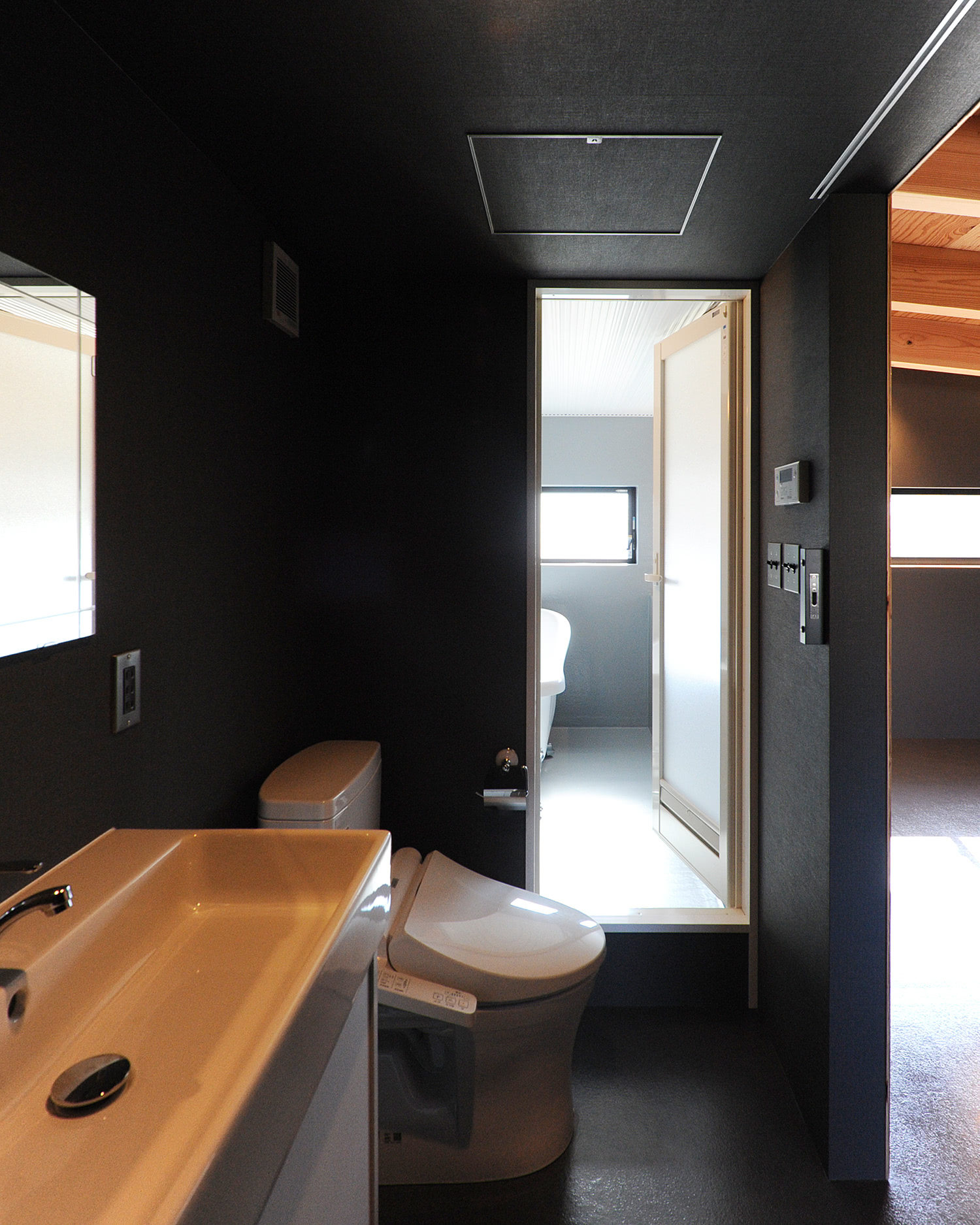 水回りは2階にひとまとめ。(※写真は別棟)黒の壁と床がほんとに斬新。