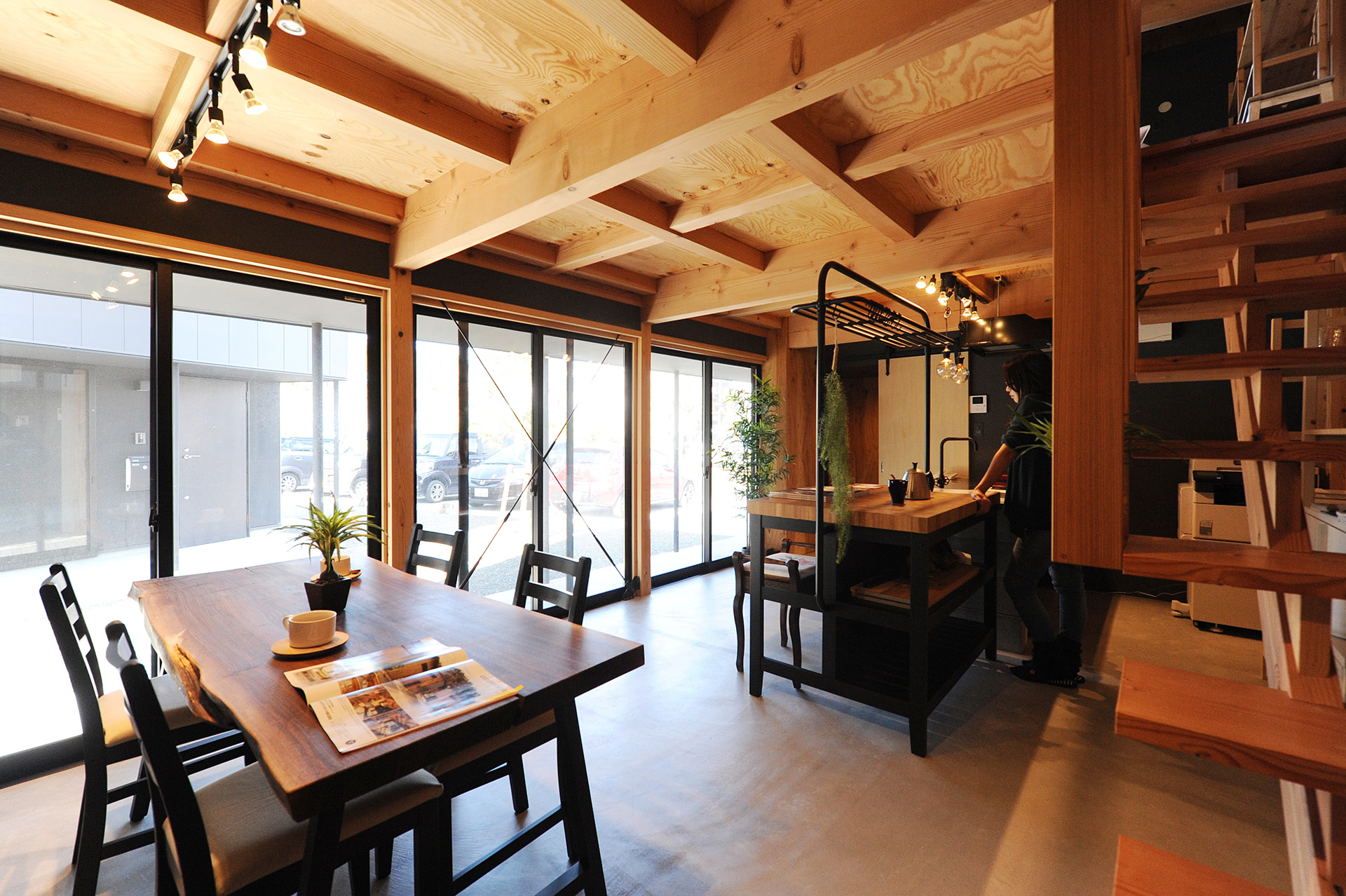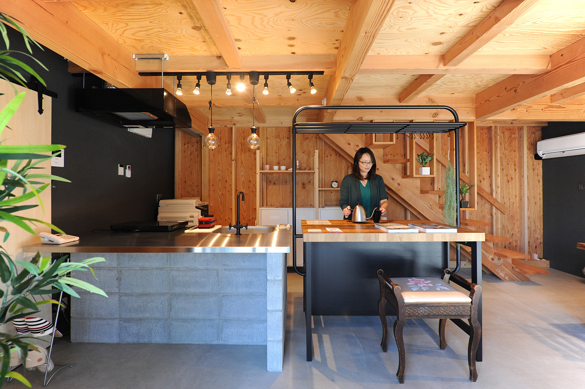 構造をそのまま表しにしています。「このままでも格好いいから隠しちゃうのもったいないなと。予算も抑えられますし。」という良子社長は、コンクリート打ちっぱなしの床、ブロックのキッチンなど潔いほど足さない。