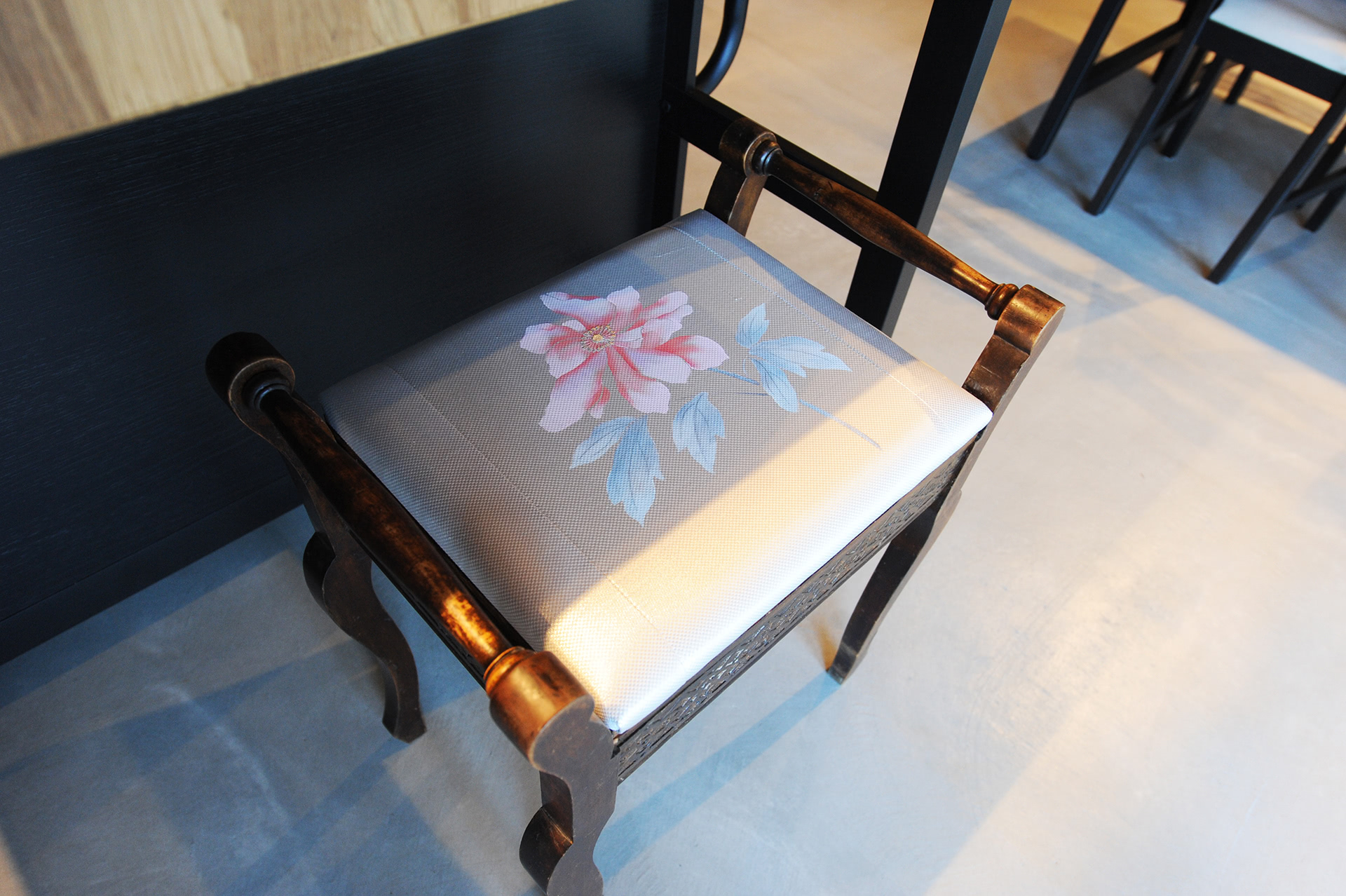 オーダーして製作したアンティーク家具と着物の帯を組み合わせたスツール。