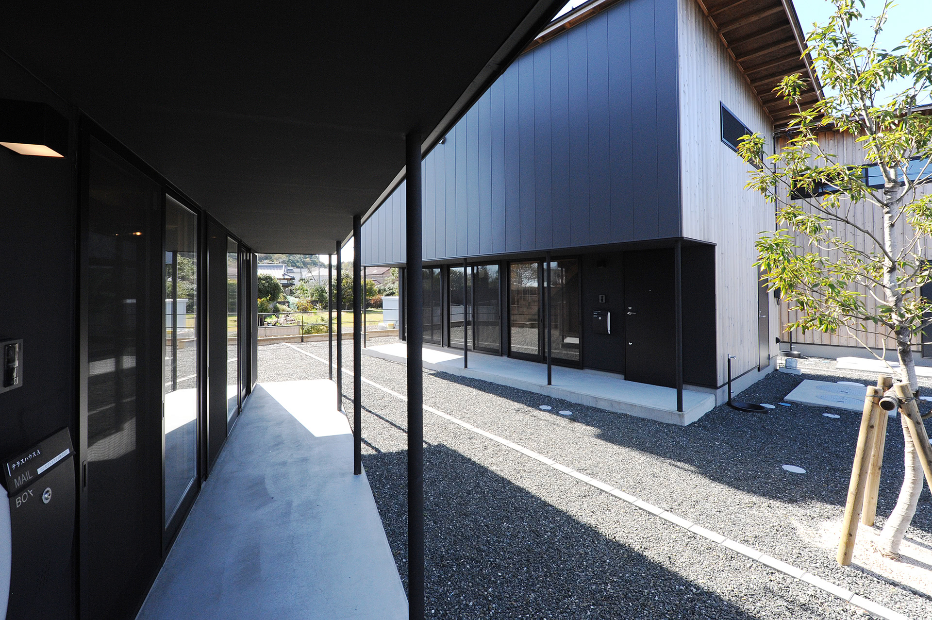 建物南側から。ガルバと唐松の外壁と片流れ屋根の家が点在。各棟ほぼ同じ間取りですが、内装は白系と黒系と2パターンあります。