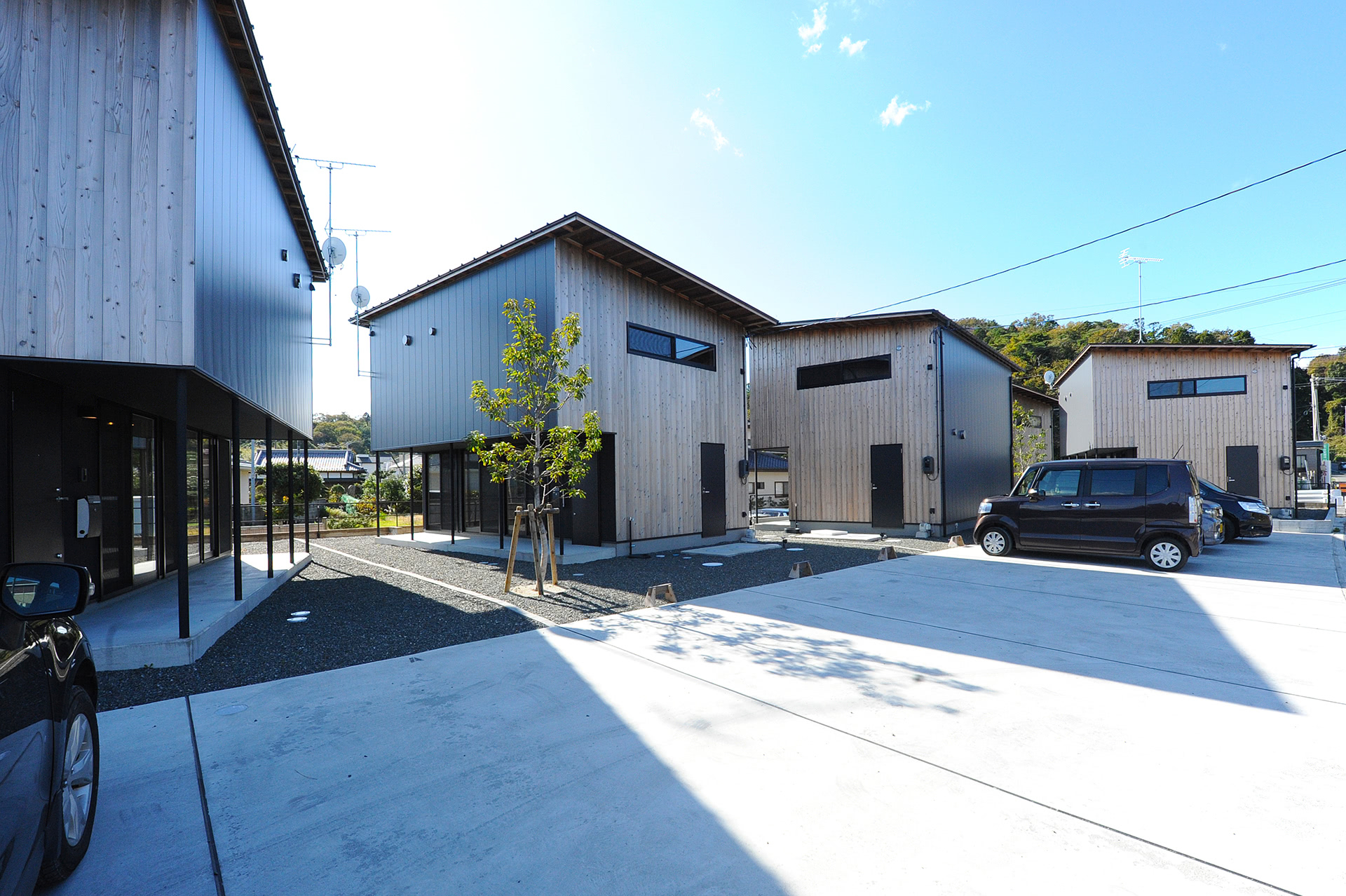 230坪の敷地にランダムに配置した駐車場3各台付きの5棟の家は、建物同士が呼応しあっているかのようです。「もっとオープンに、もっと自由に暮らして欲しい」という思いが込められています。