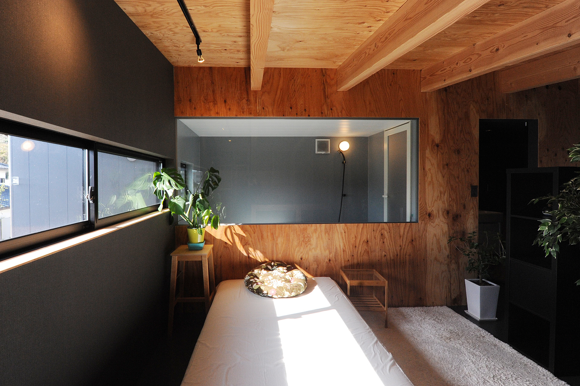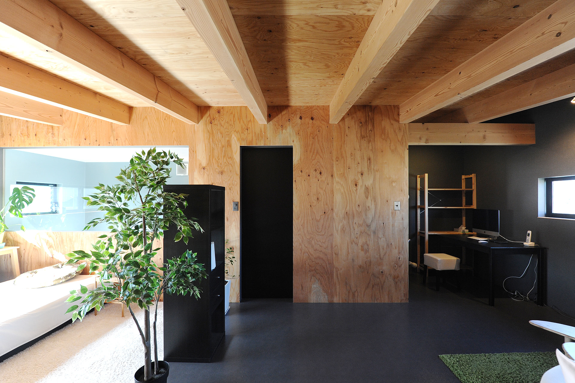 黒の内装と構造用ラーチ合板のミスマッチ感が絶妙。「全部木をむき出しにするとくどくなりがちなので、壁の一部と床は黒にしました。室内は好きなように使ってください。」