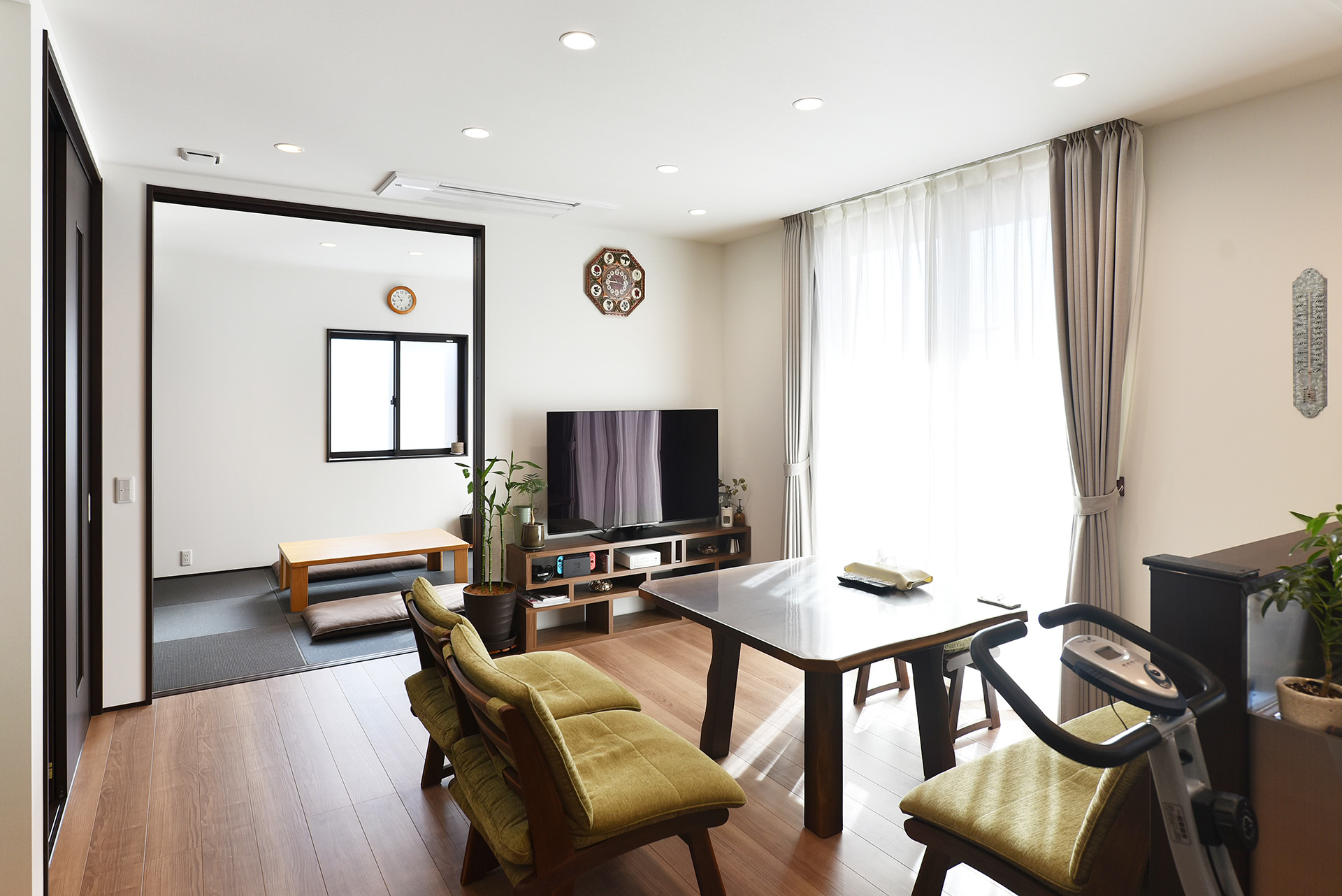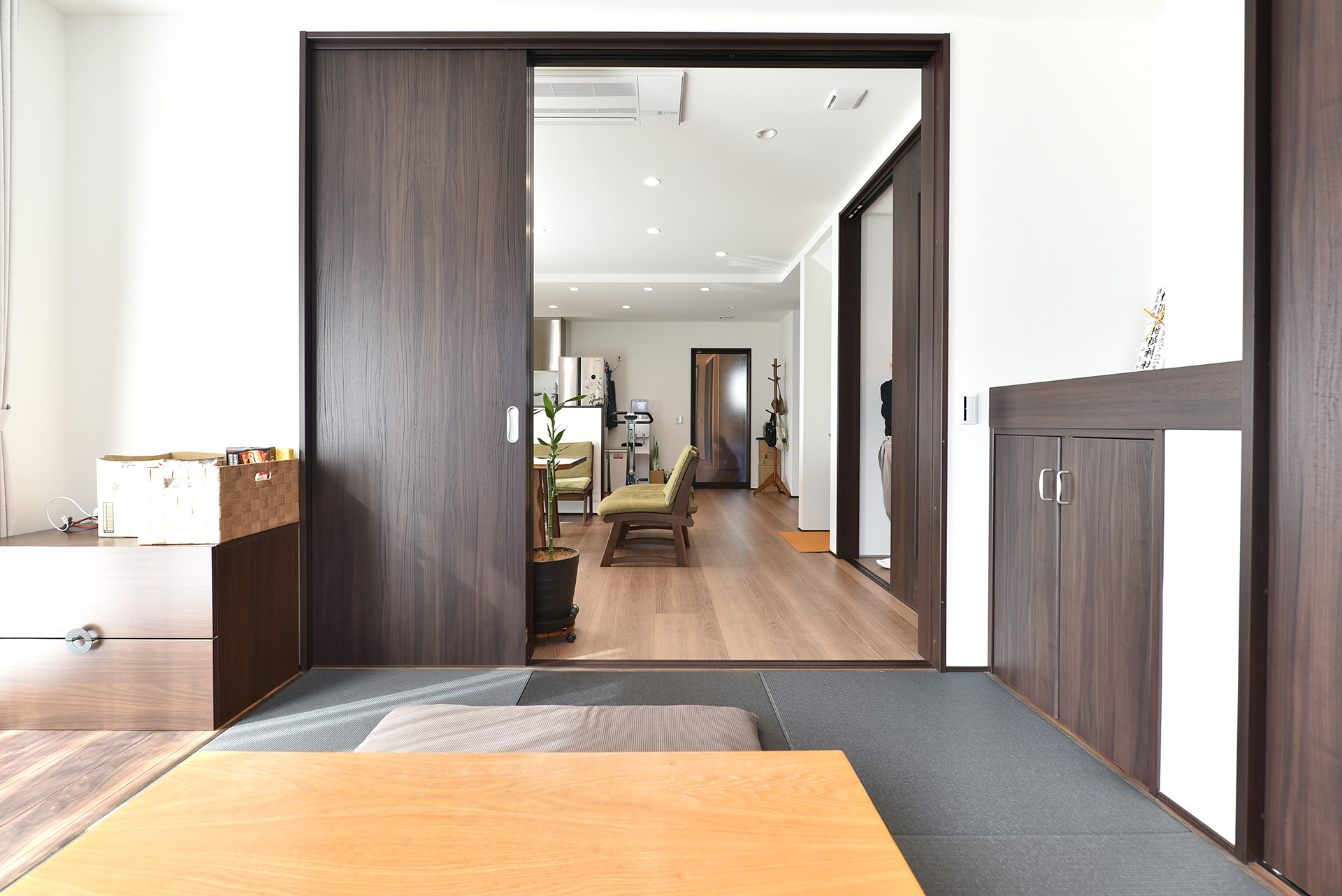 置き畳の和室からリビング、キッチン方面。「ゴロゴロしたいときはやっぱり和室。」とご主人