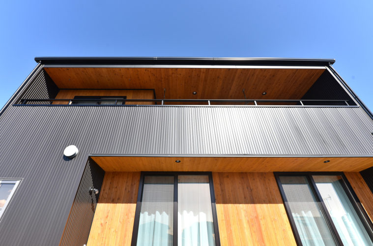 黒いガルバリウム鋼板の外壁に唐松を加え、モダン&ナチュラルな雰囲気。
