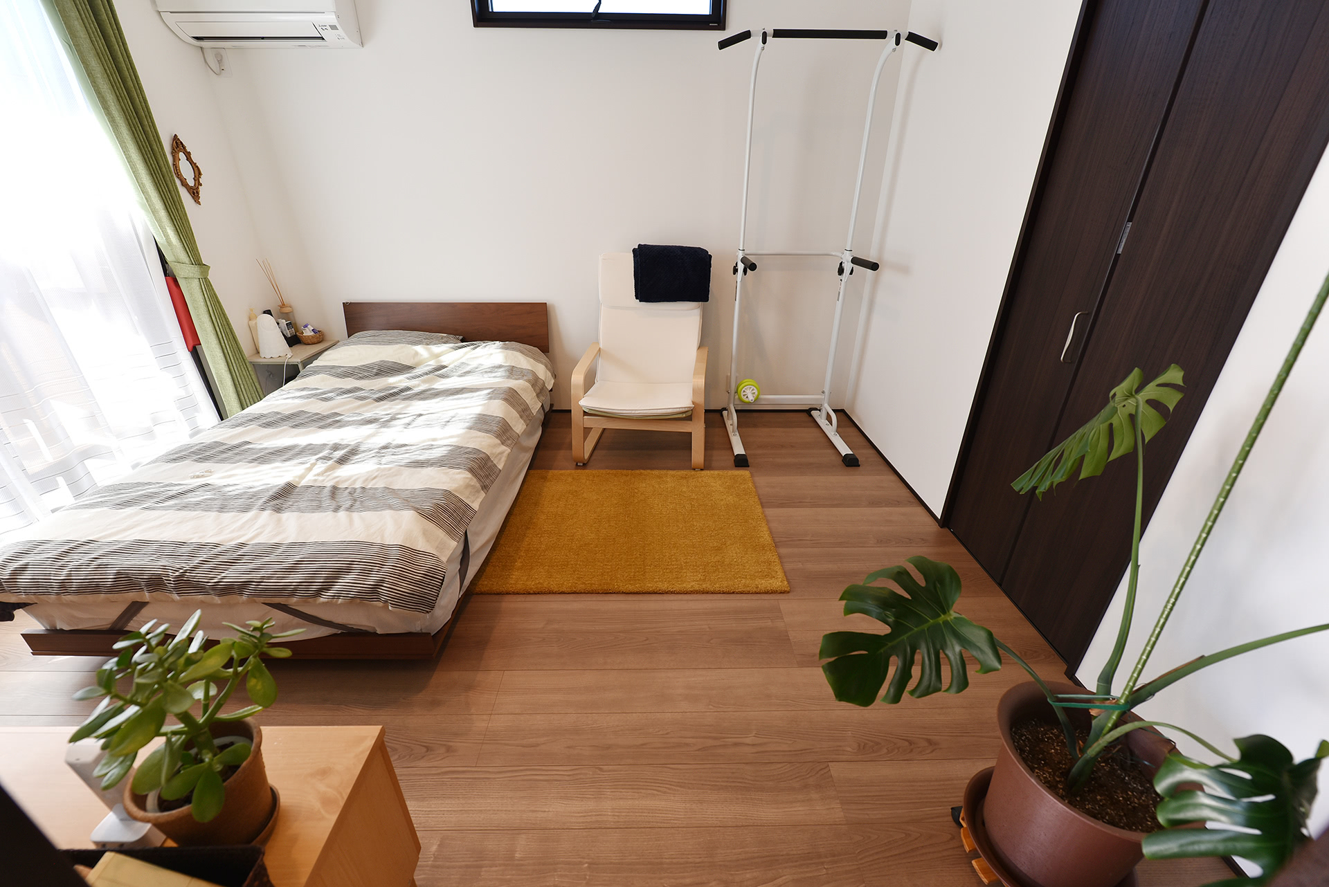 2階主寝室。「アパートのときより全然広いのに、室内では暑さも寒さもあまり感じません。」と奥様。「今回は長期優良認定は取りませんでしたが、全く同等の断熱・気密仕様になっています」と鐵専務。癒やしのグリーンも元気ですね。