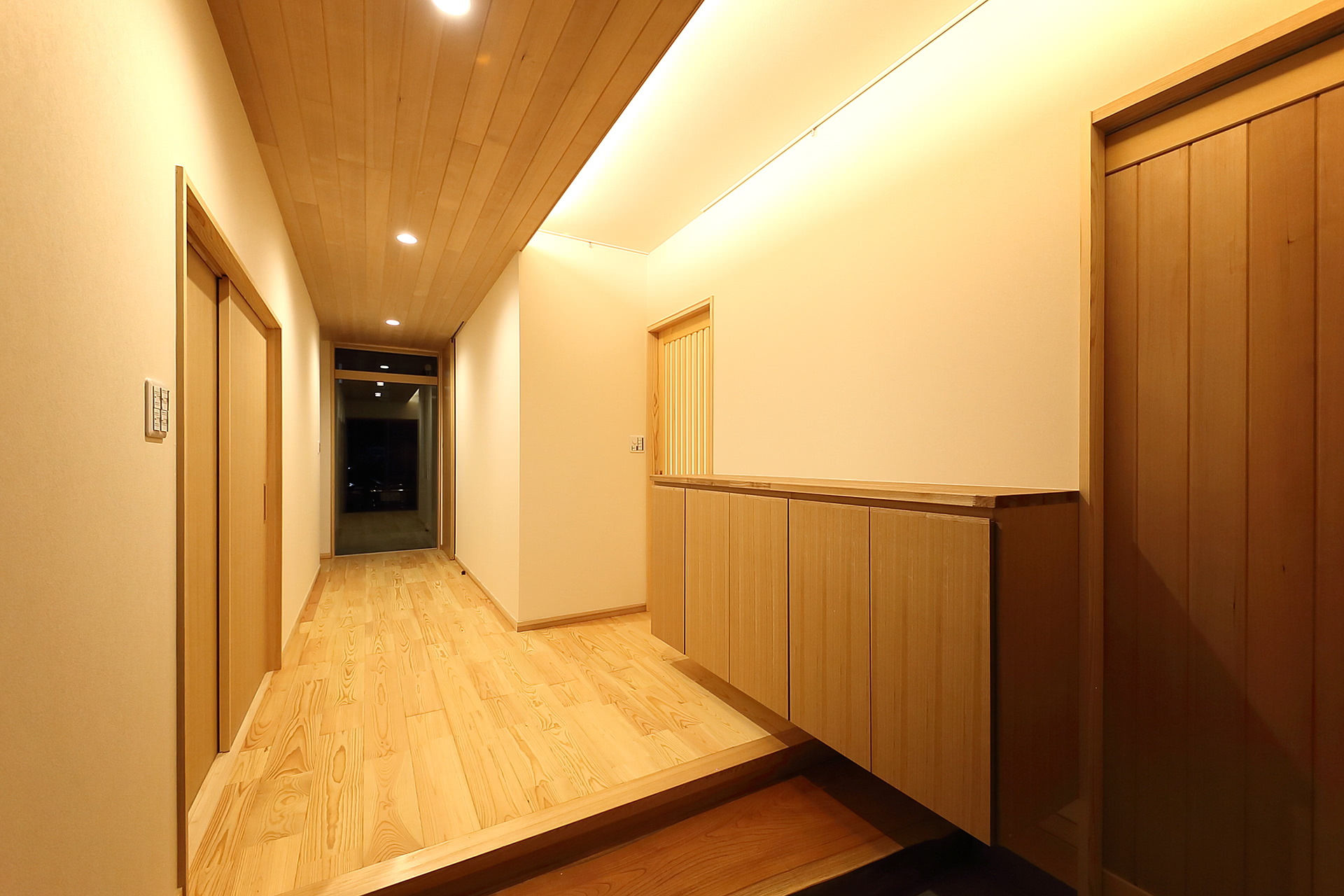 以前の住居から欅の式台を再利用した玄関。下駄箱を浮かせ、間接照明を使うことで空間にゆとりを。右側はシュークロ―ゼット。
