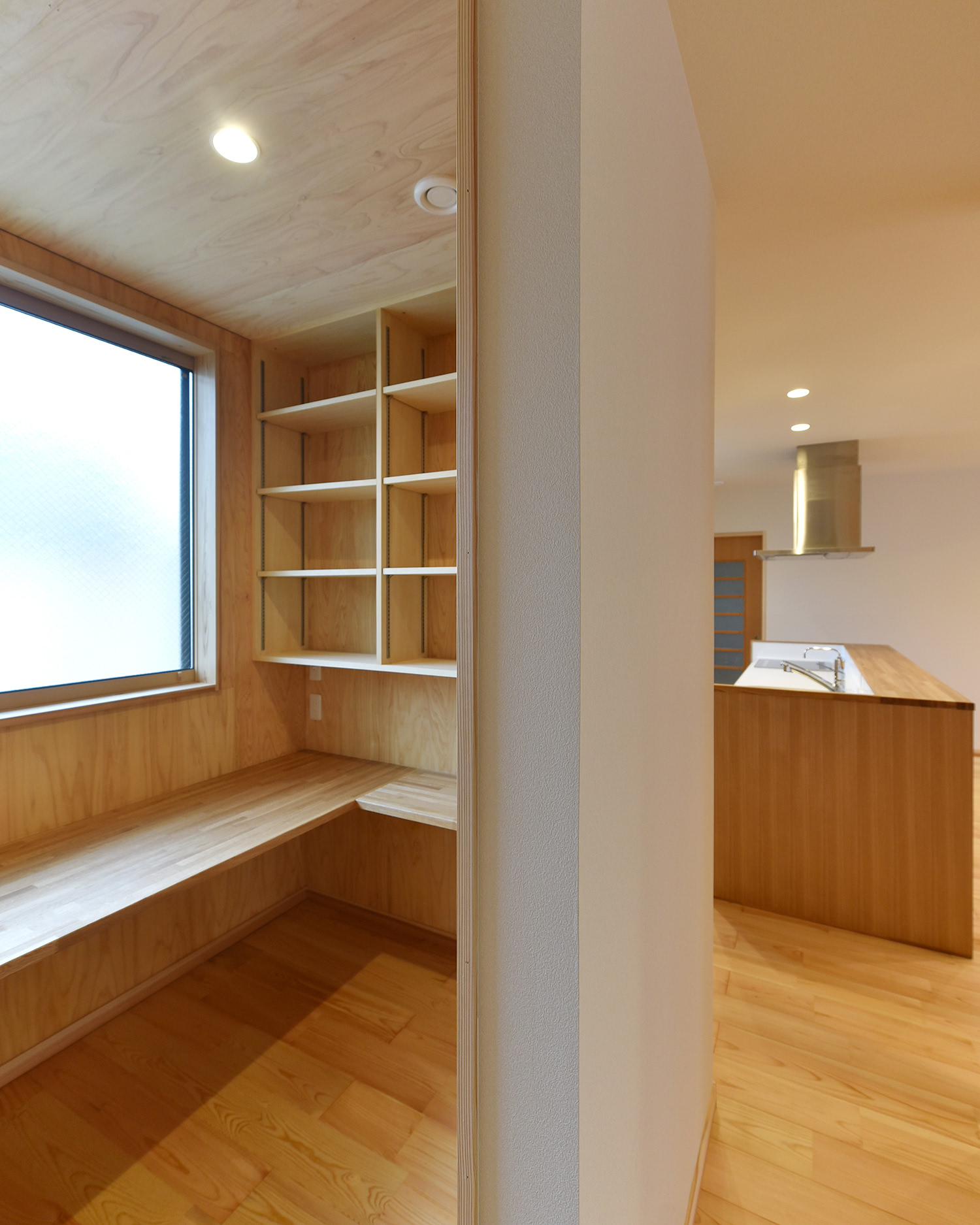 キッチン脇は食料庫かと思いきや、ご主人の書斎。家族から付かず離れずの距離感がポイント。食料庫は反対側にあります。