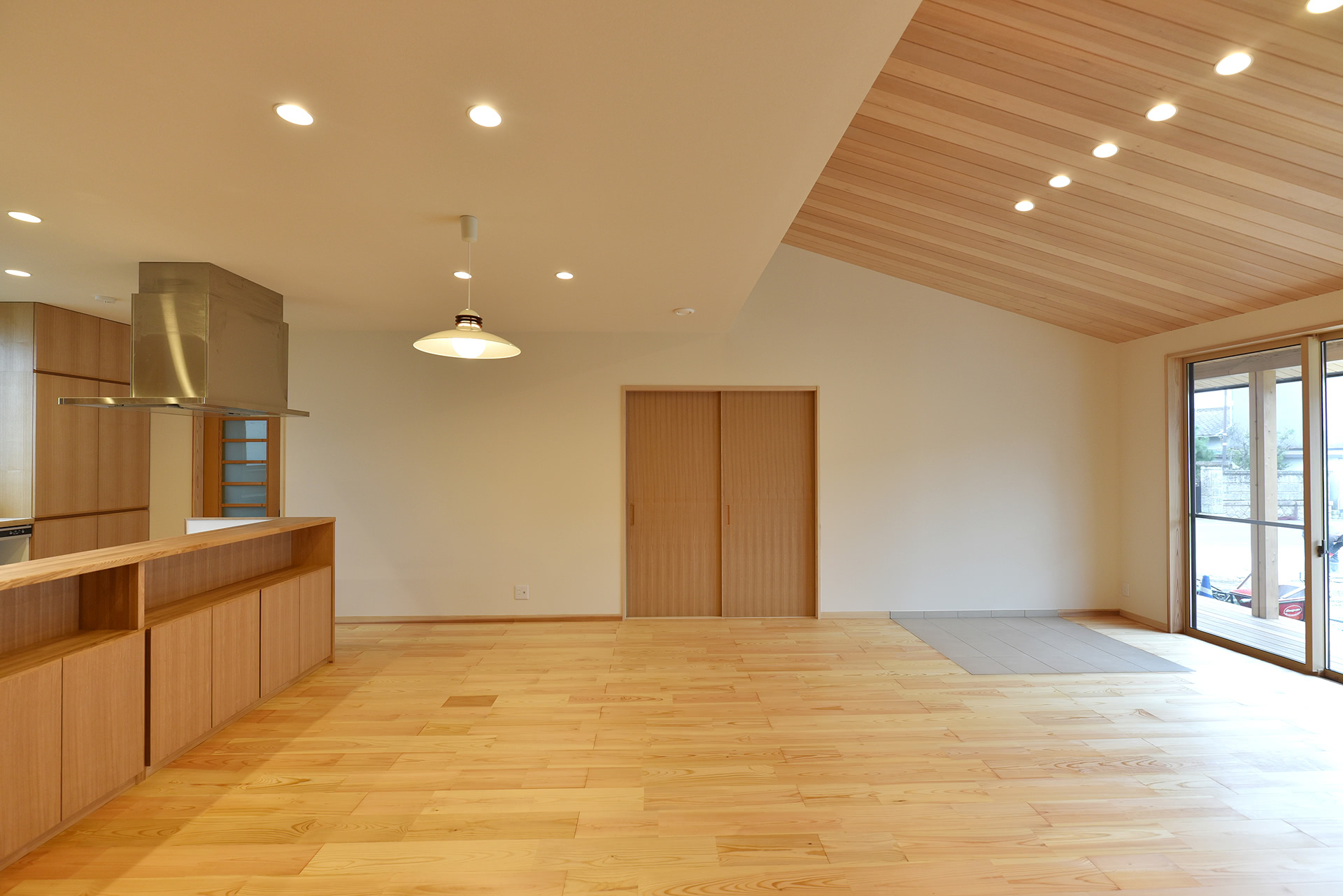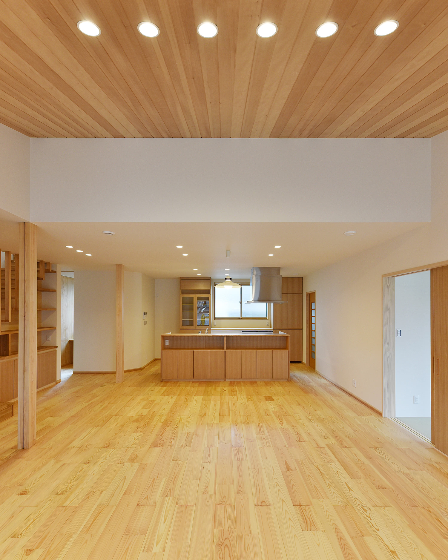 堂々と奥行きの感じられるI型のLDK空間。L型かI型か検討を重ね、建主様のご希望でI型にするとともに、天井に変化をつけて直線的過ぎないようにしました。