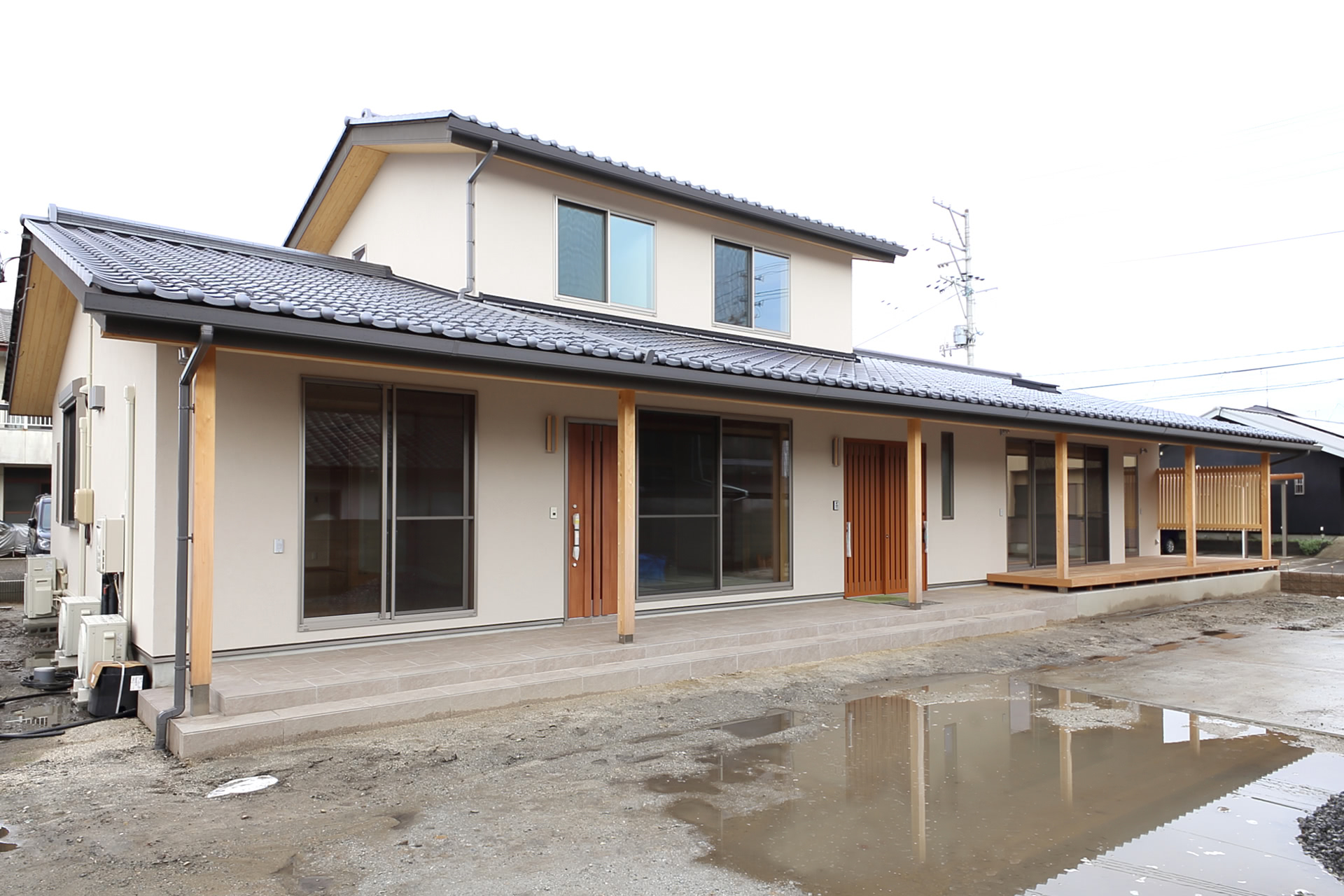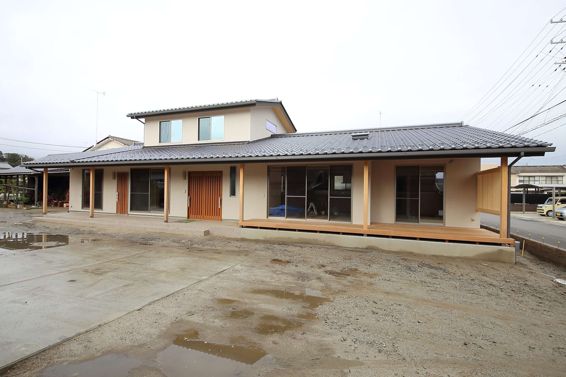 高さを抑え軒を出し、ジョリパット塗壁を施した和風の佇まい。デッキ部分もすべて軒下に。四季があり降雨量も多い日本では軒が役立ちます。