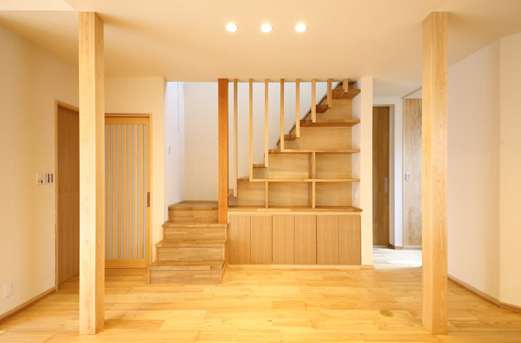 玄関と階段方面。家の中心となり上下階をつなぐ収納階段がフォーカルポイントに。
