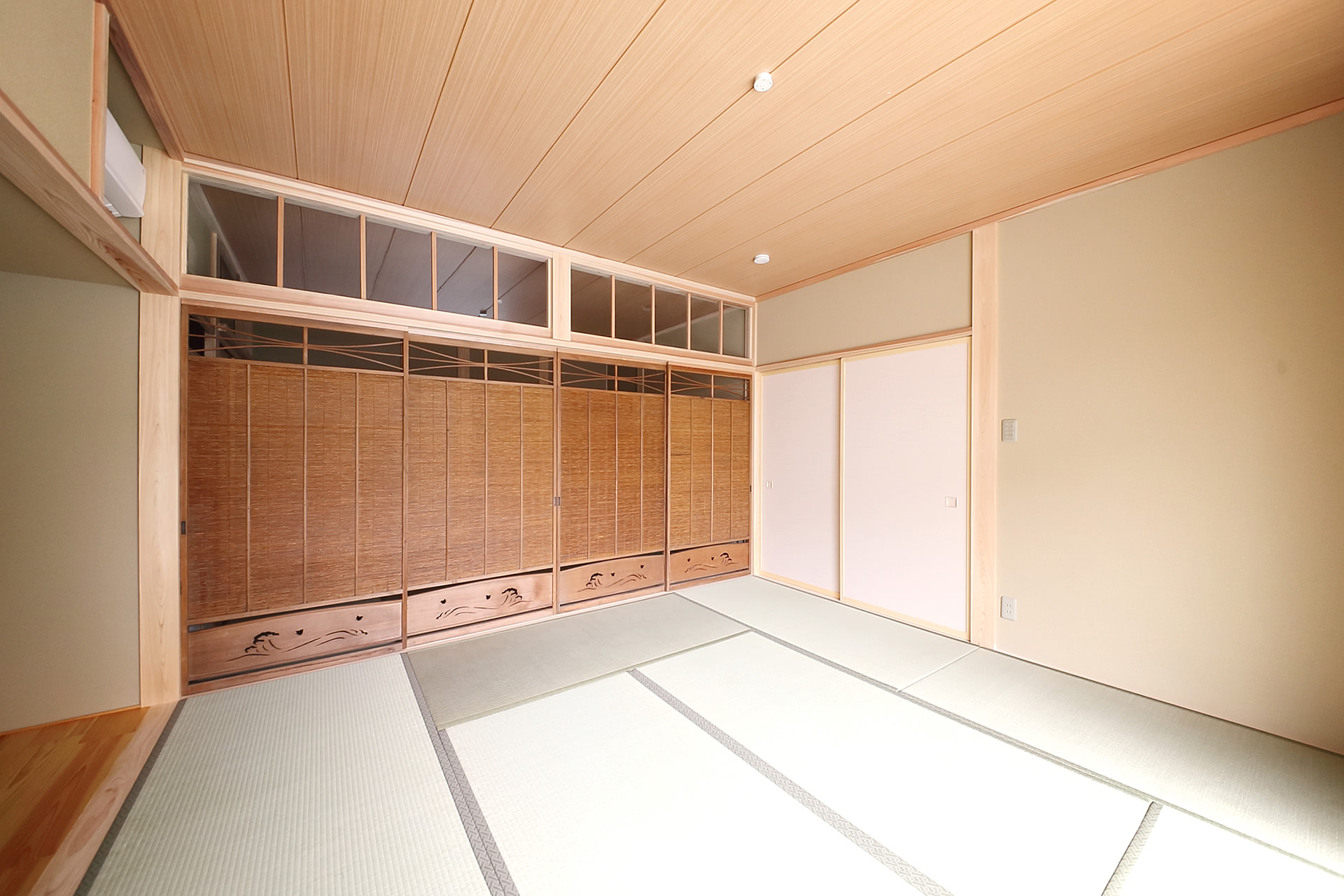 以前の家の建具などを再利用することで思い出を繋ぎます。二間続きの和室の間には高さを調整した簾戸をはめ込みました。欄間部分は前の家の古ガラスを利用、採光にも一役。