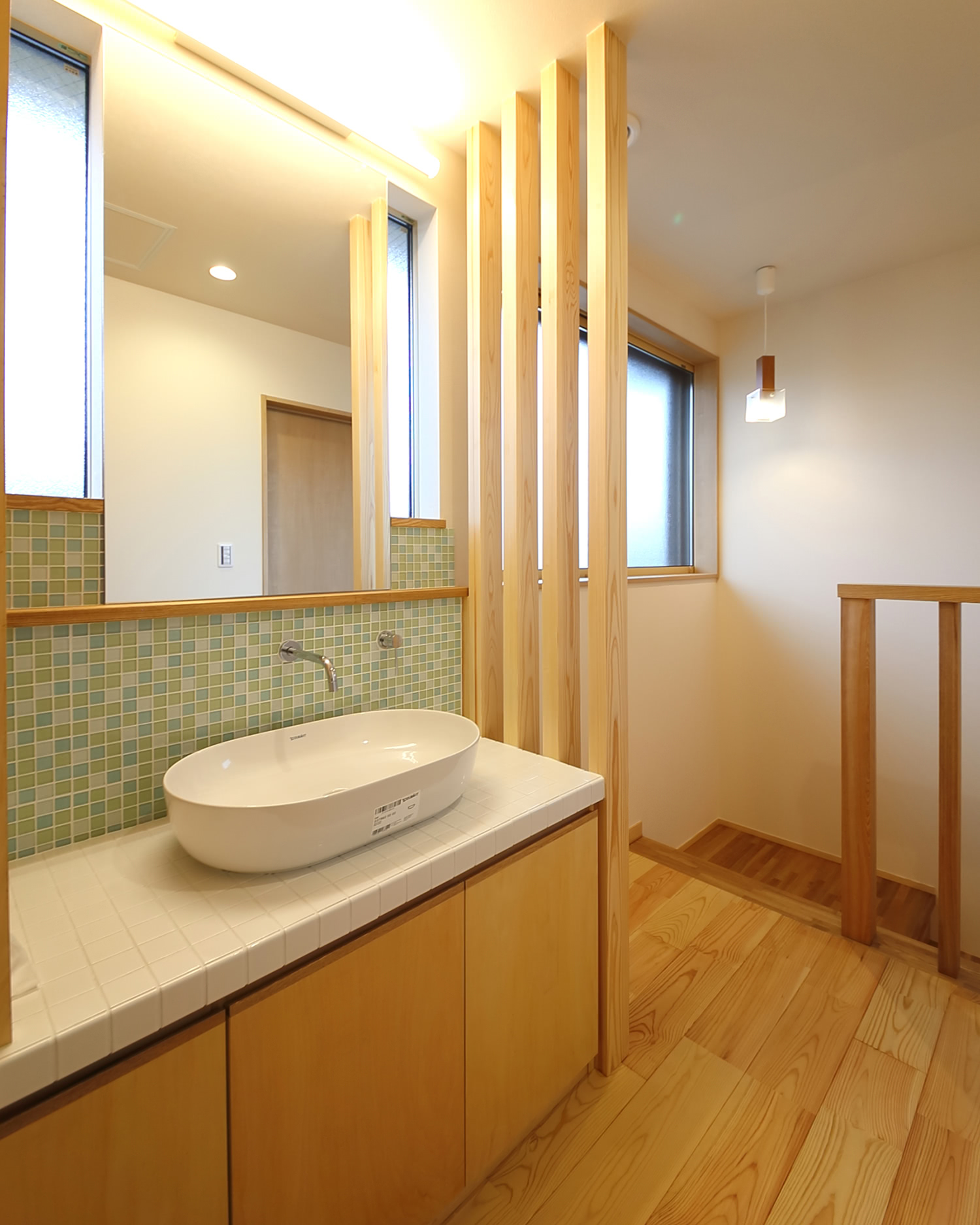 2階の洗面は娘さんのセレクトでタイルを組み合わせました。