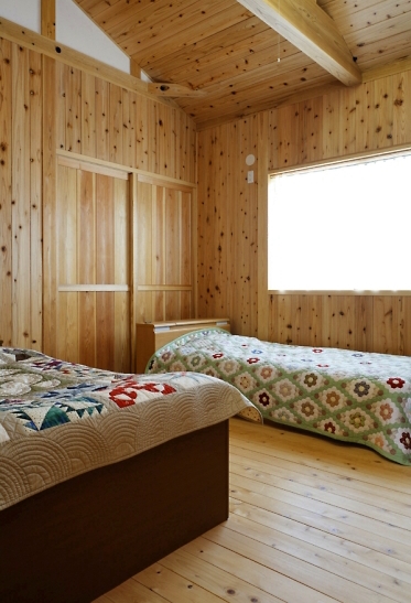 自然に根付いた暮らし。それは家づくりの「工法」、「材料選び」からすでにスタートしています。壁に使われた杉材。床には檜材。いずれも無塗装のものを使い、まるで木が呼吸するのを感じられるような、暖かみのある家になりました。