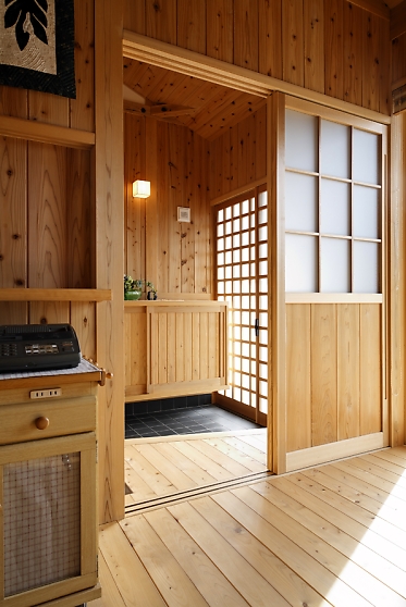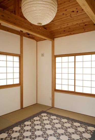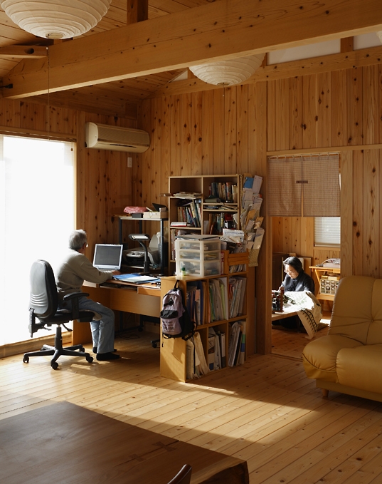 定年退職後に住まわれるご夫婦の住宅。自然素材の持つ圧倒的な素材力の前に小細工は無用でした。構造材は杉、床板、壁、建具、その他の材料もすべて無垢の材料とし、合板類はいっさい使用していません。内外装は左官工事 (土壁・漆喰)も伝統工法を極力活用しました。まさに自然の恵の家。