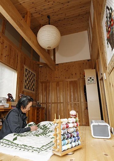 奥様の優しい色合いのパッチーワークは木の家と相まってほっと安らぎを与えてくれます。