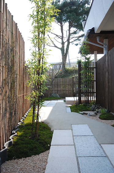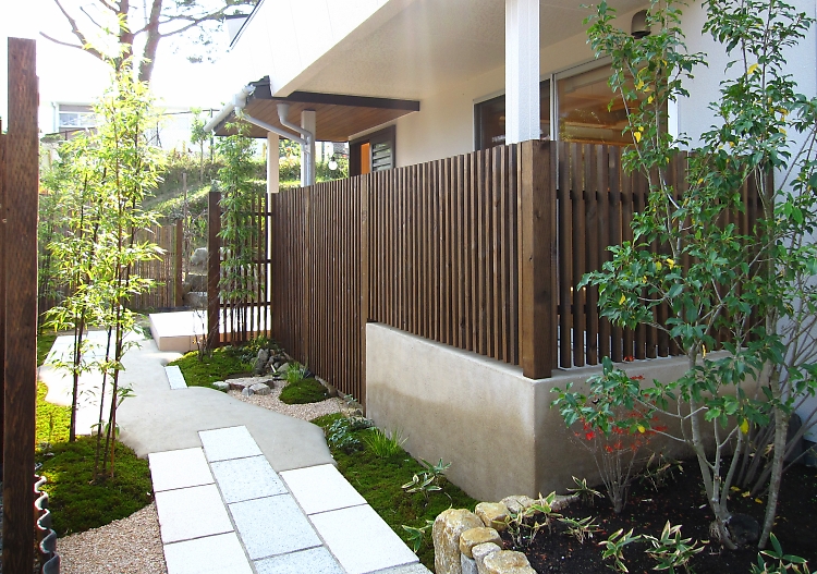 玄関に続くアプローチは北郷創庭舎が設計施工。訪れる人の目線を自然に誘導しプライバシーを守る仕掛けなど考えつくされています。玄関につくまでのひと時を癒しと楽しさを交え演出しています。