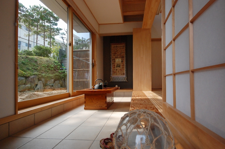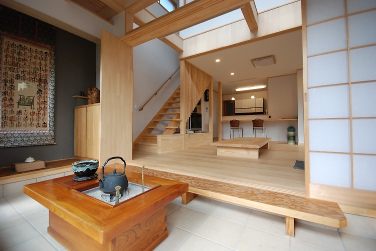 玄関を入ると約5畳の土間。庭とリビングをゆるやかにつないでいます。土間は囲炉裏を置いて接客スペースにもなります。改修前と同じ位置に設けた床の間もセンスよく飾られています。