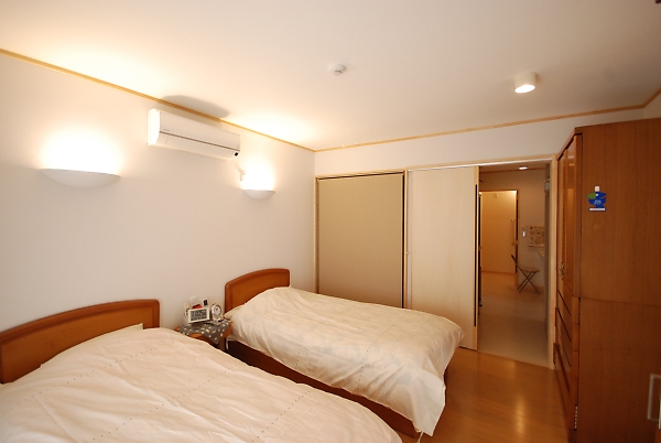 2階は来客用の寝室です(写真左)。足が入るパソコンスペースは足元暖房付(写真右)。