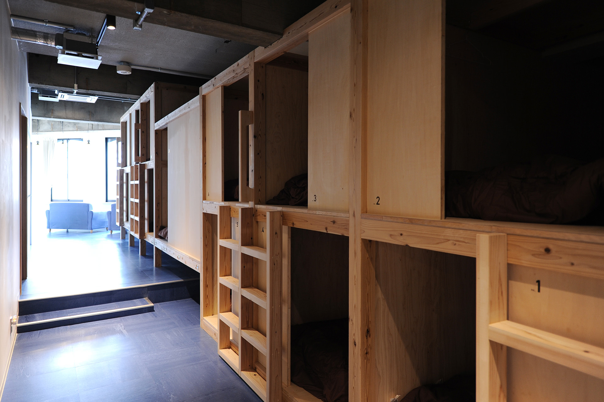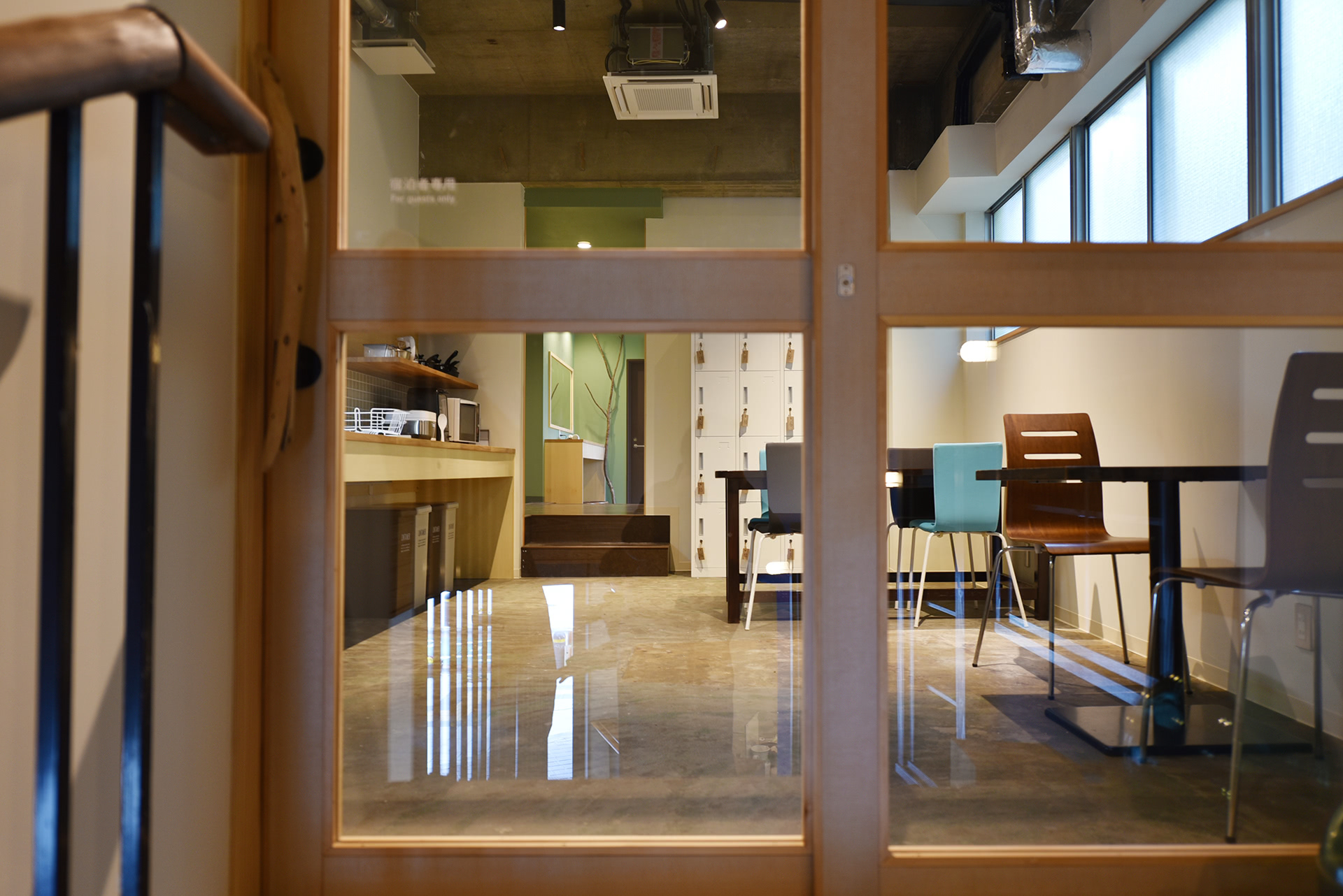 階段を上がりガラスのドアの向こうは、ゲストハウスのラウンジ。ここからは宿泊者専用スペースです。