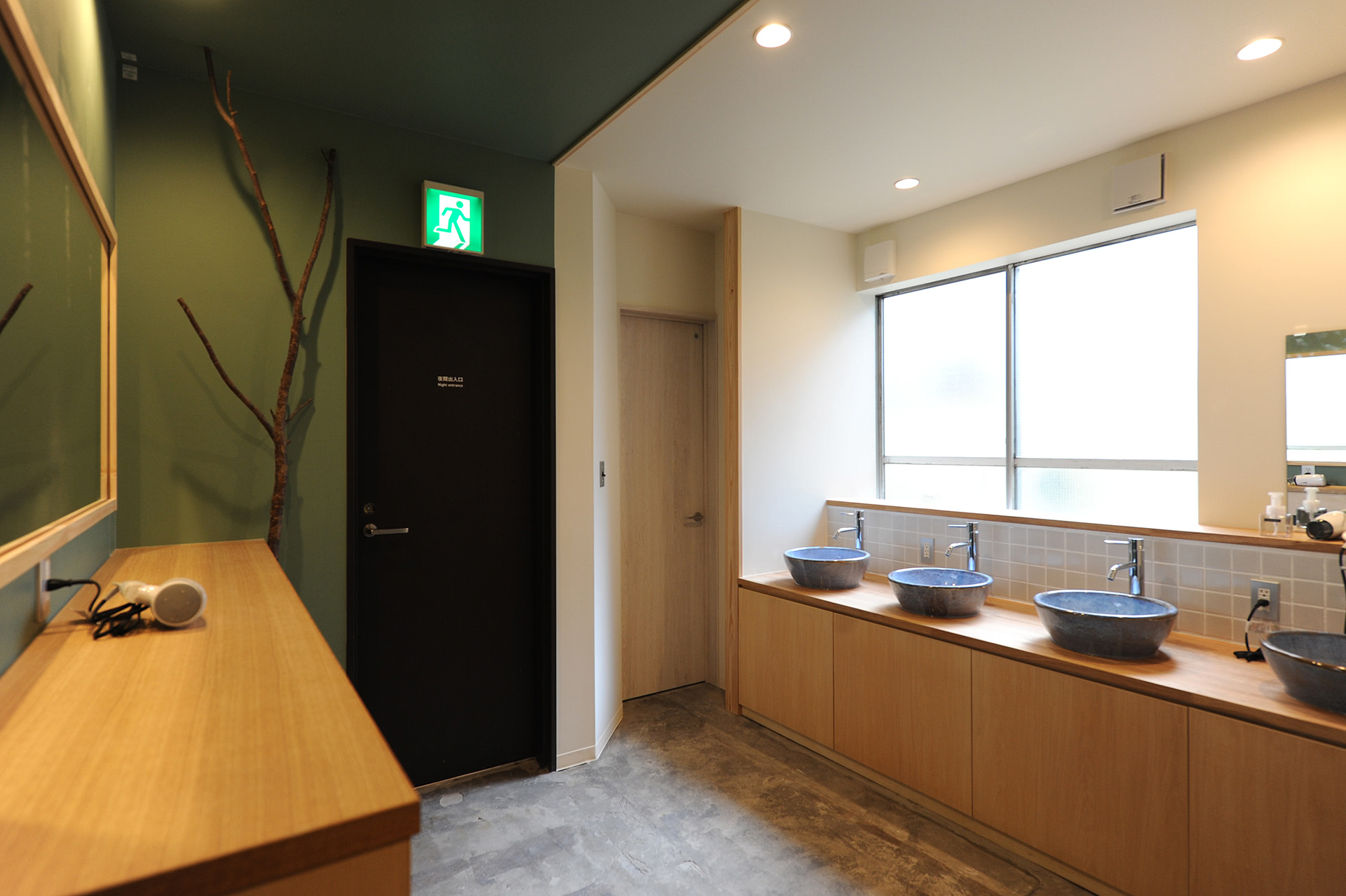 いわきの焼物「唯芳窯」による洗面器、いわき産の木材、無垢材家具ワークショップ、古材活用、四ッ倉の浜でみつけた流木を建具の引き手など、あるものを活かしながら旅行客にいわきらしさを感じていただけるよう工夫しました。