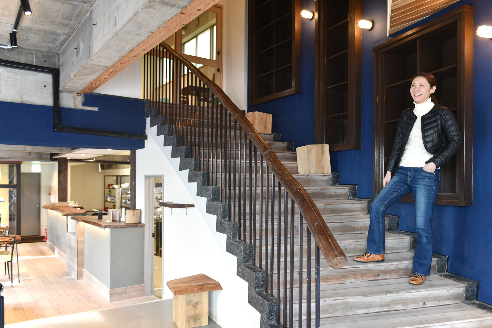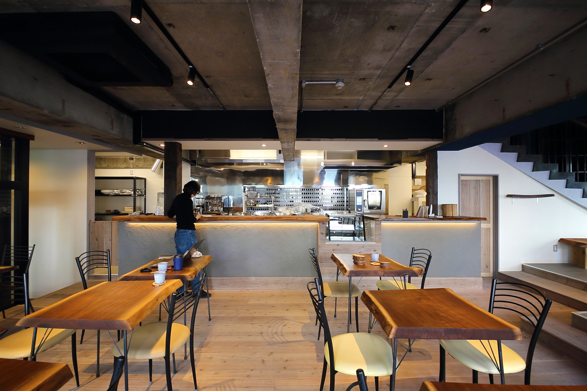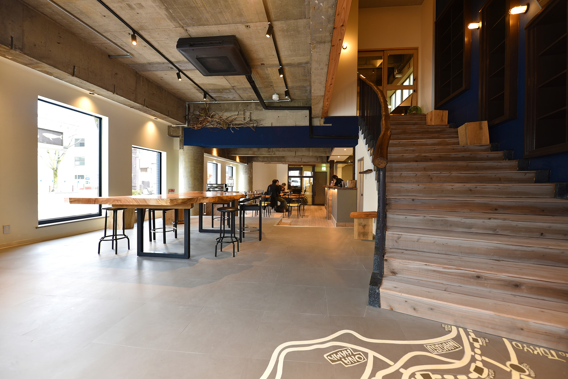 右手が2階ゲストルームへの大階段。1階手前は栃のテーブルを中心としたイベントスペース。奥がカフェスペースです。他にポップアップストアやレンタル書房など様々な使い方ができます。