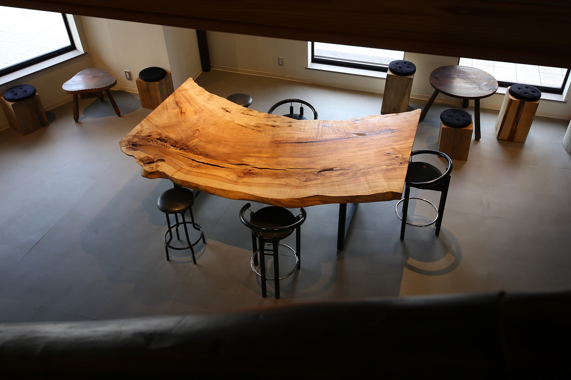 階段から栃のテーブル方向を見下ろしたところ。小テーブルやスツールがランダムに配置されていて、自分だけのお気に入りの「居場所」が見つかります。