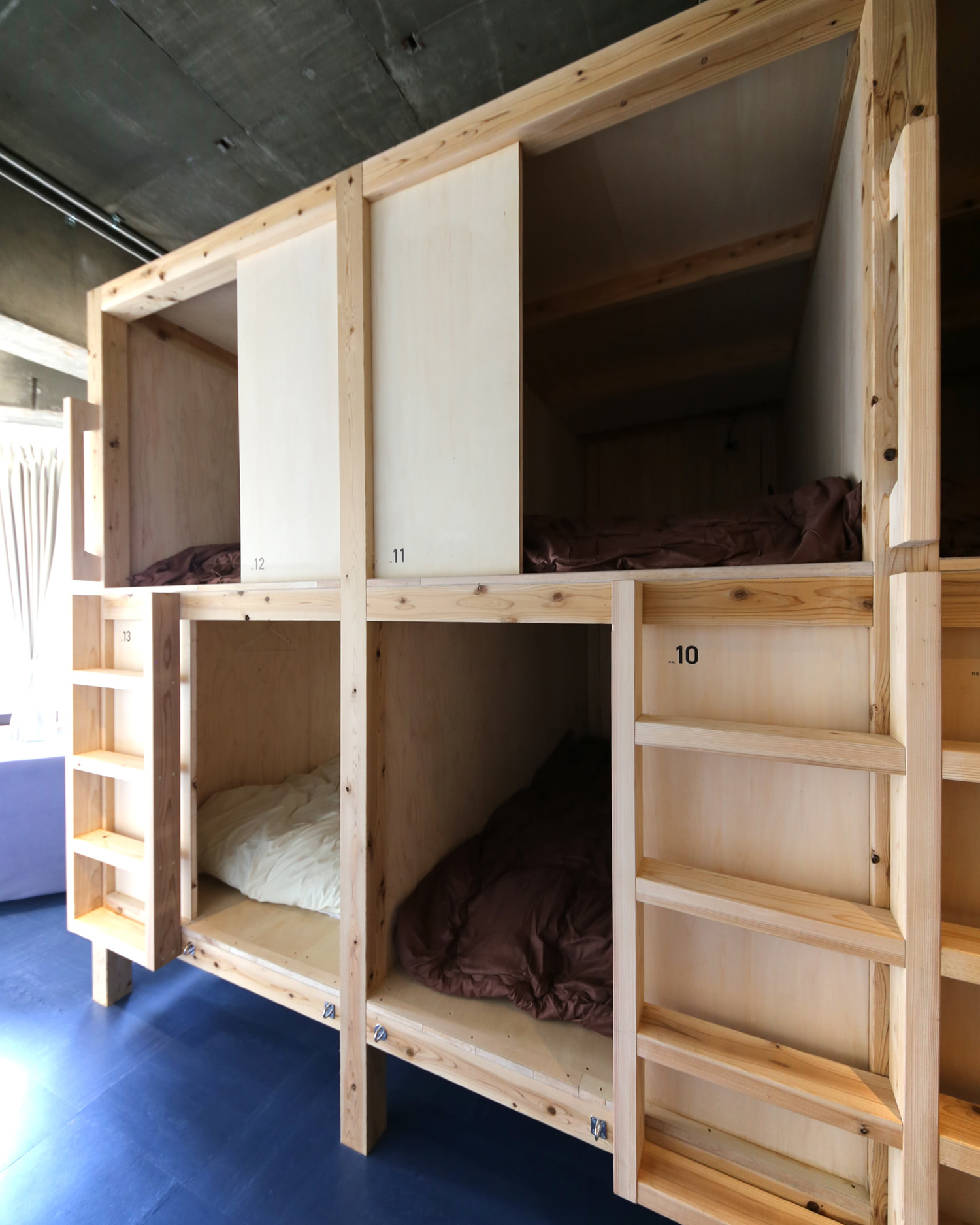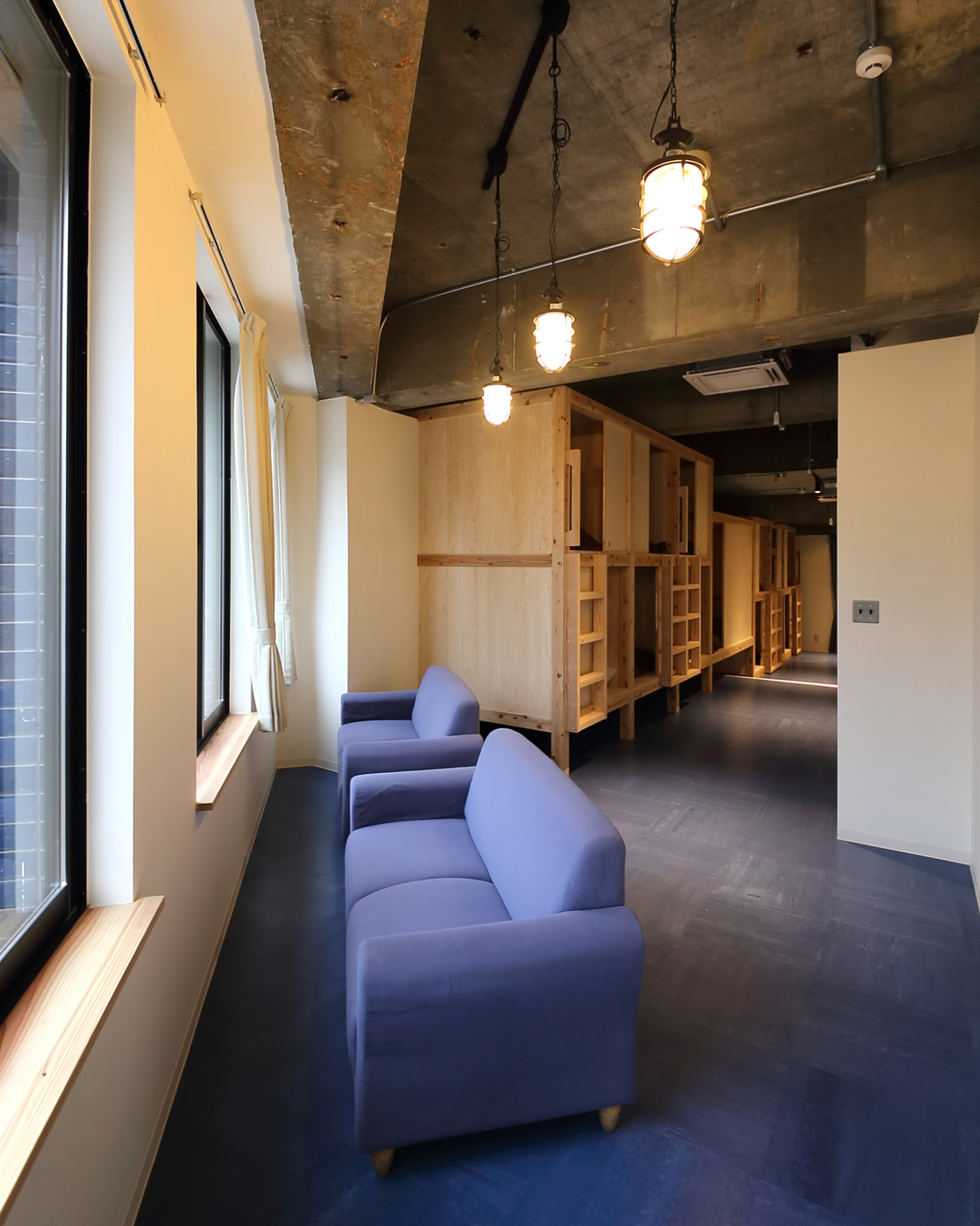 平面的、断面的にも変形、変化ある建物なので、既存建物形状を活かした客室や水まわりのおさまりを考えた間取りとしました。また、保健所の許可が必要なので飲食店、簡易宿泊所の許可が得られるつくりとするために、間仕切りなどの位置を決めるポイントとなりました。