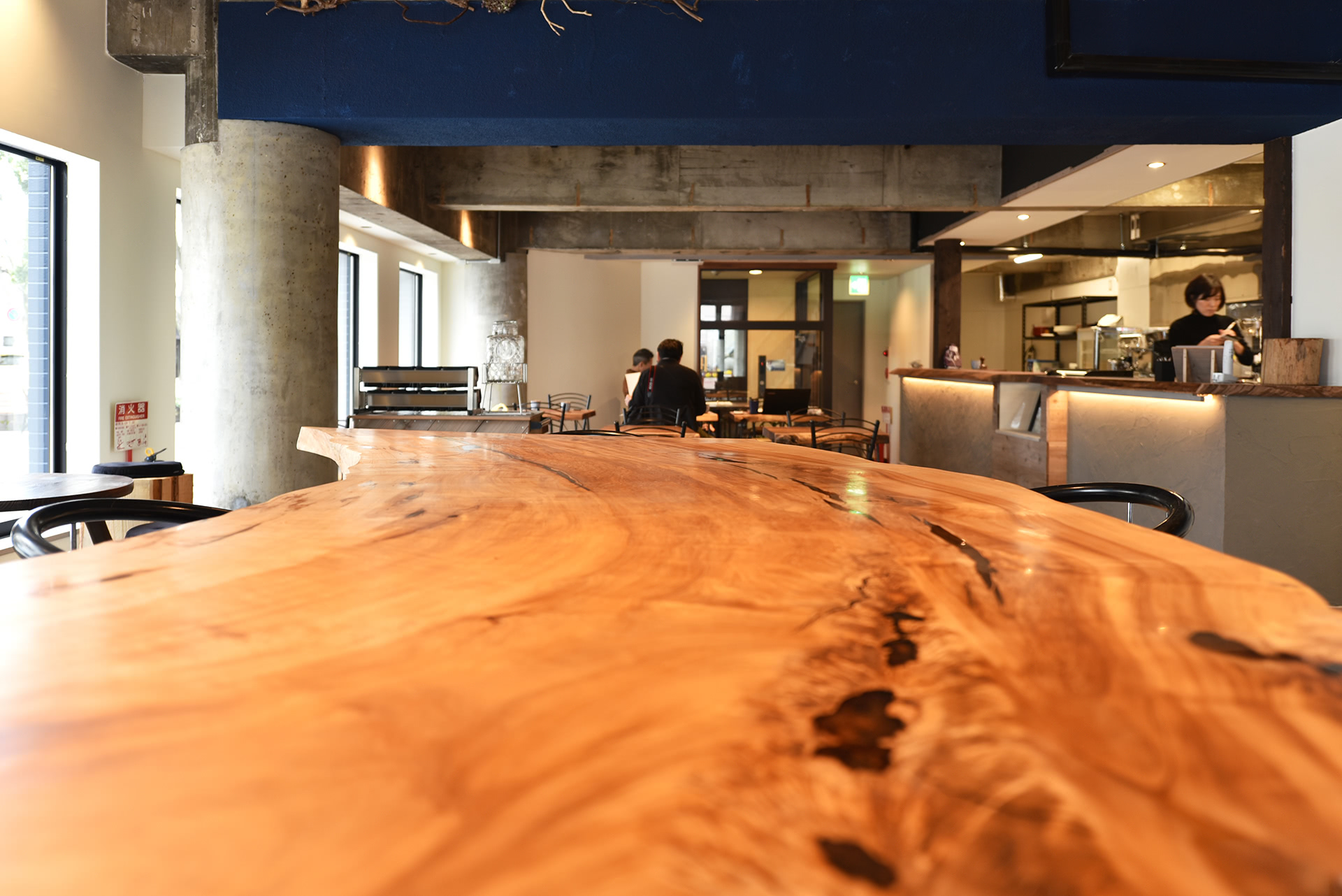 栃の一枚板テーブルは弊社正木屋材木店で製作。植物由来のレジン(樹脂)で仕上げています。