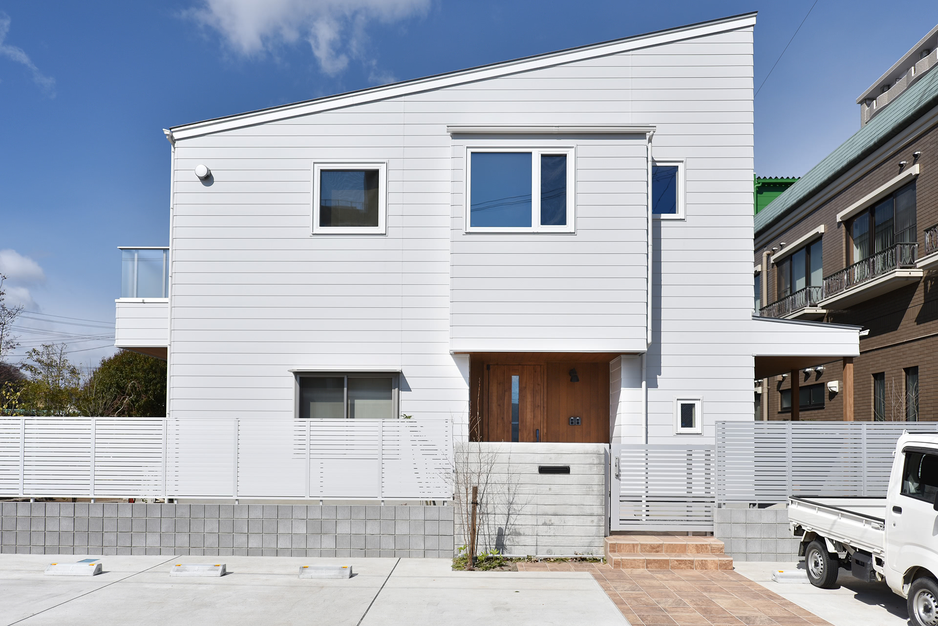 片流れの屋根には大容量の太陽光発電パネルを設置。スッキリした白のガルバ横張りに玄関のレッドシダー。