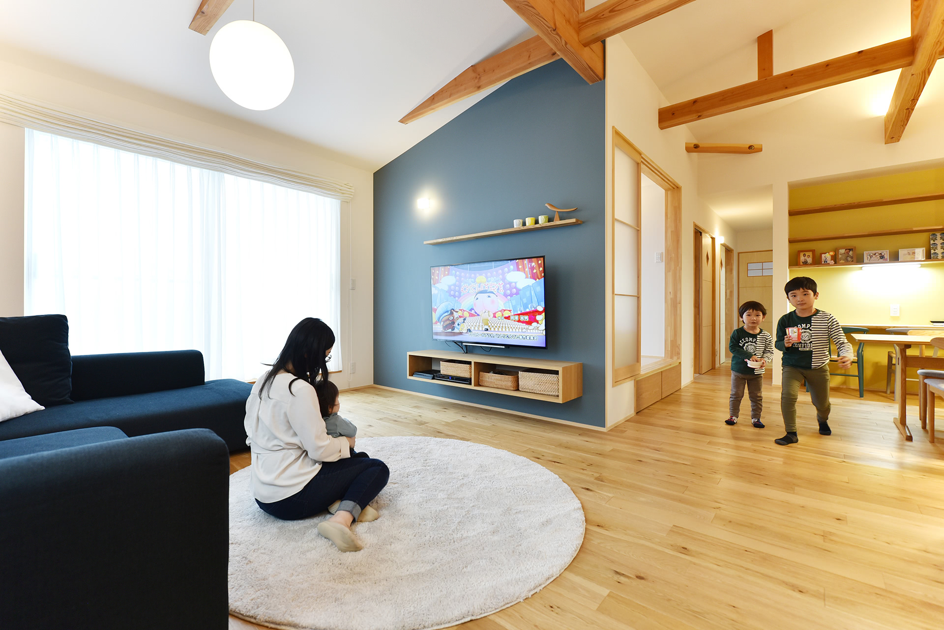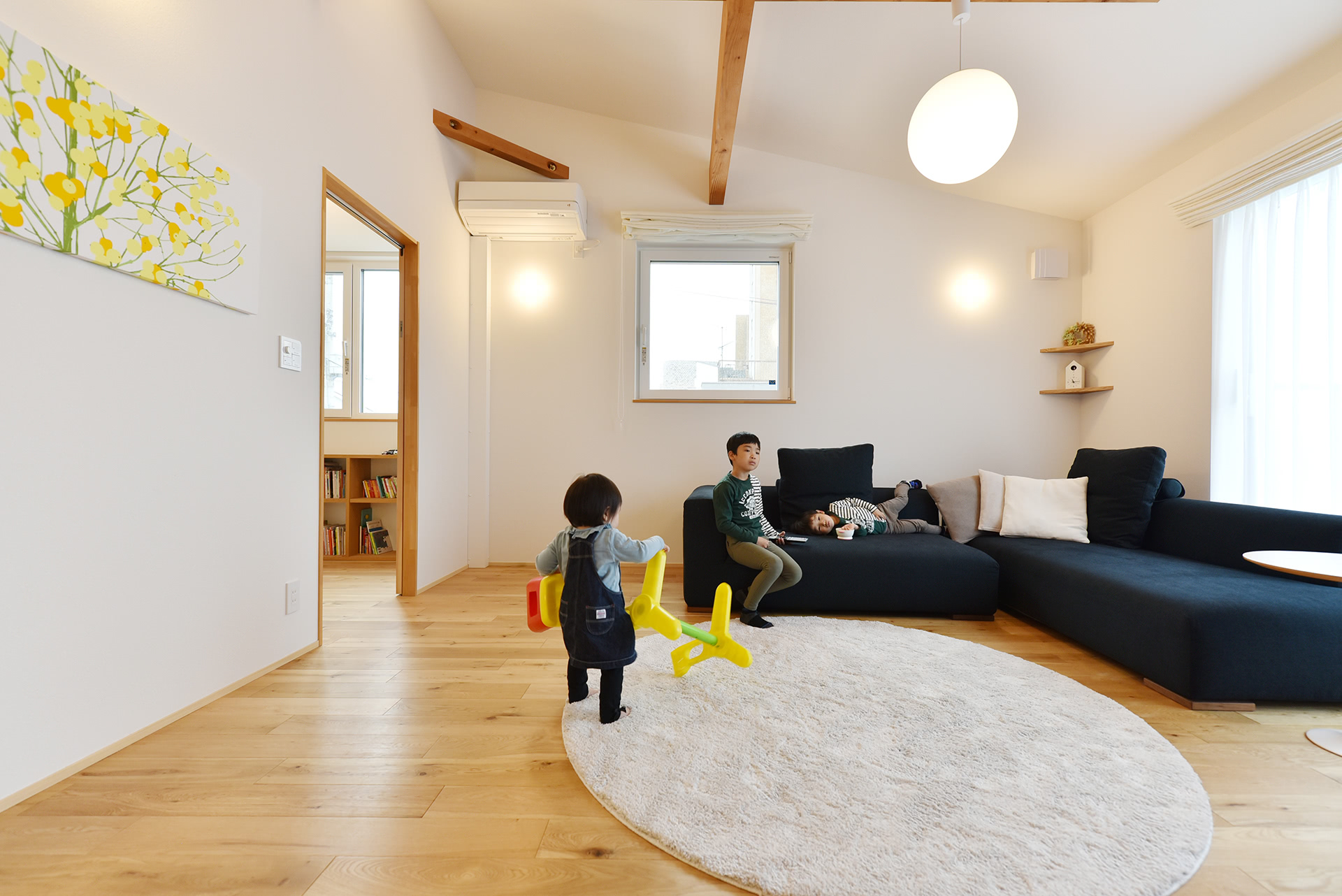 そこで理系ご主人が探して見つけたのが、ZEH(ゼロ・エネルギー住宅)を超えるドイツ基準のパッシブハウスを県内でもいち早く建築し、実績もノウハウも豊富な後田工務所でした。また、奥様は北欧デザインがお好きということで、シンプルで明るい色使いが得意な後田工務所はテイスト的にもバッチリ合致。共働きで小さなお子さんが3人いる若夫婦からは、効率的に家事が行える動線のご希望もありました。