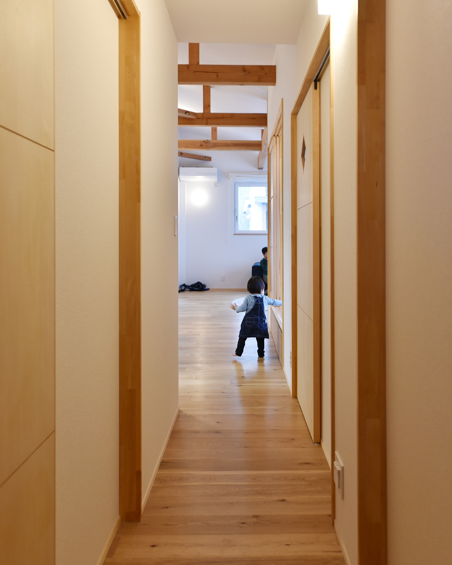 「朝起きて寝室からリビングに行くまでのこの景色が一番気に入っています。」とご主人。梁とドアの連なりが素敵ですね。