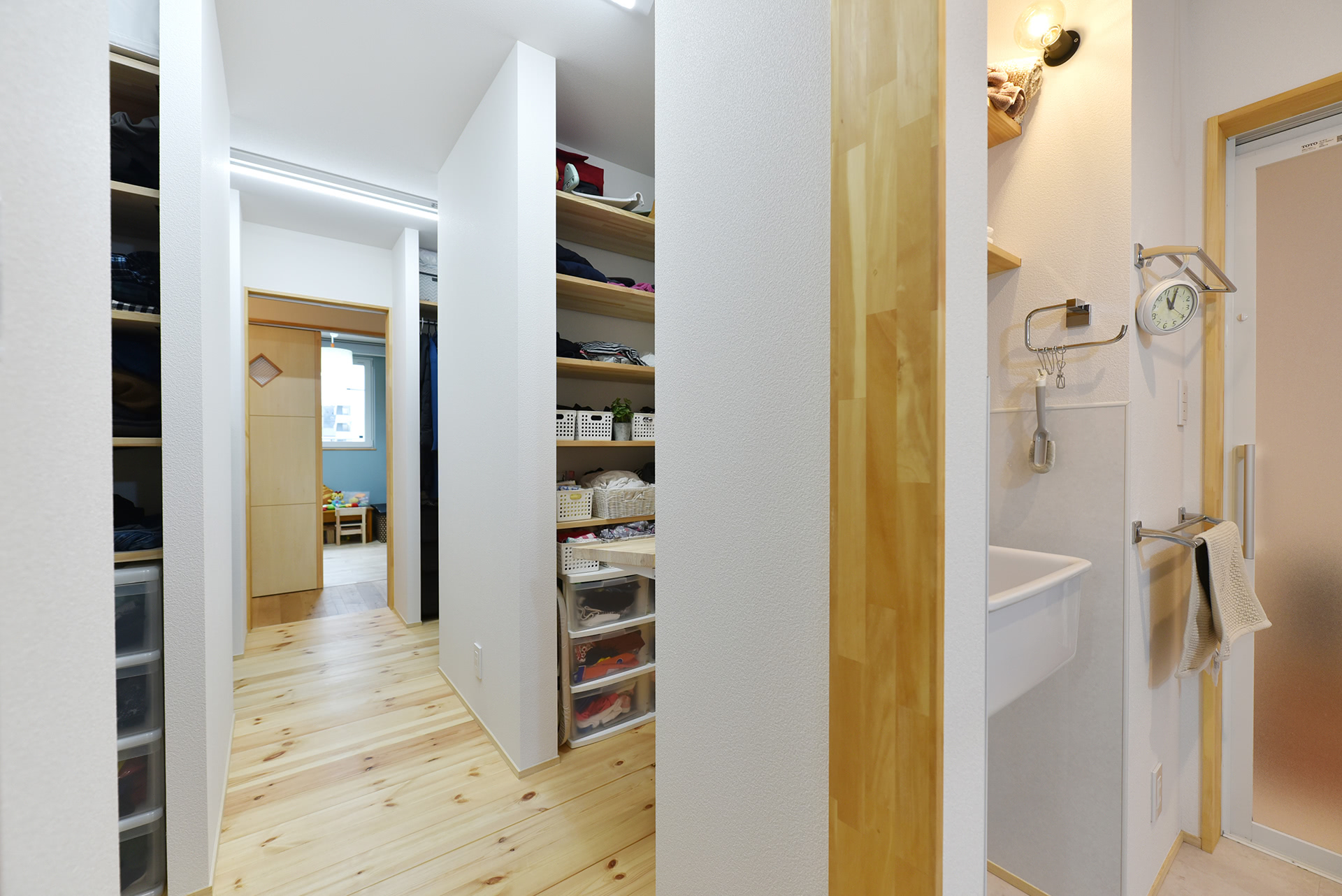 サニタリーを左に直角に曲がると、今度は大大容量のウォークスルークローゼット。収納棚が左右に計8面!各居室に隣接しており、着替えもスムーズ。