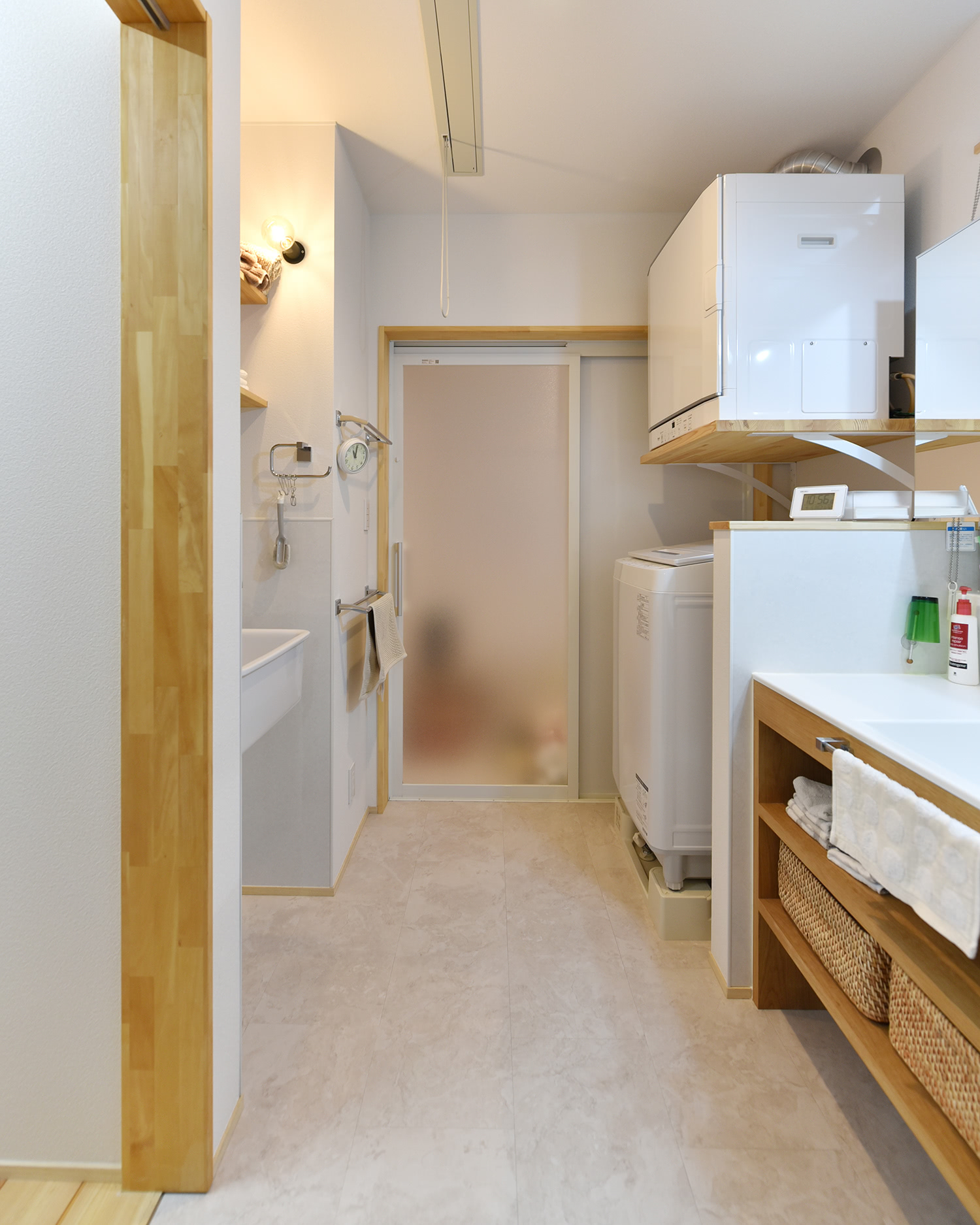 キッチンの先はサニタリー。汚れ物が洗える深型シンクも設置。
