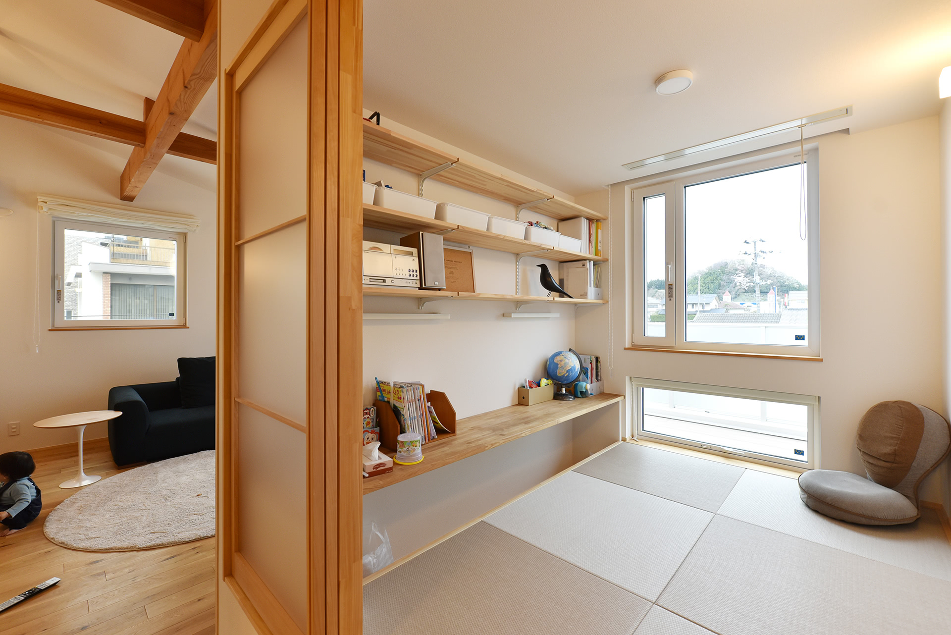 小上がりの和室は子どもたちが読書や勉強に集中できるよう机の足元を掘りごたつのように一段下げています。