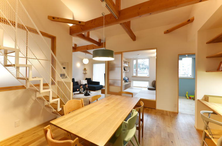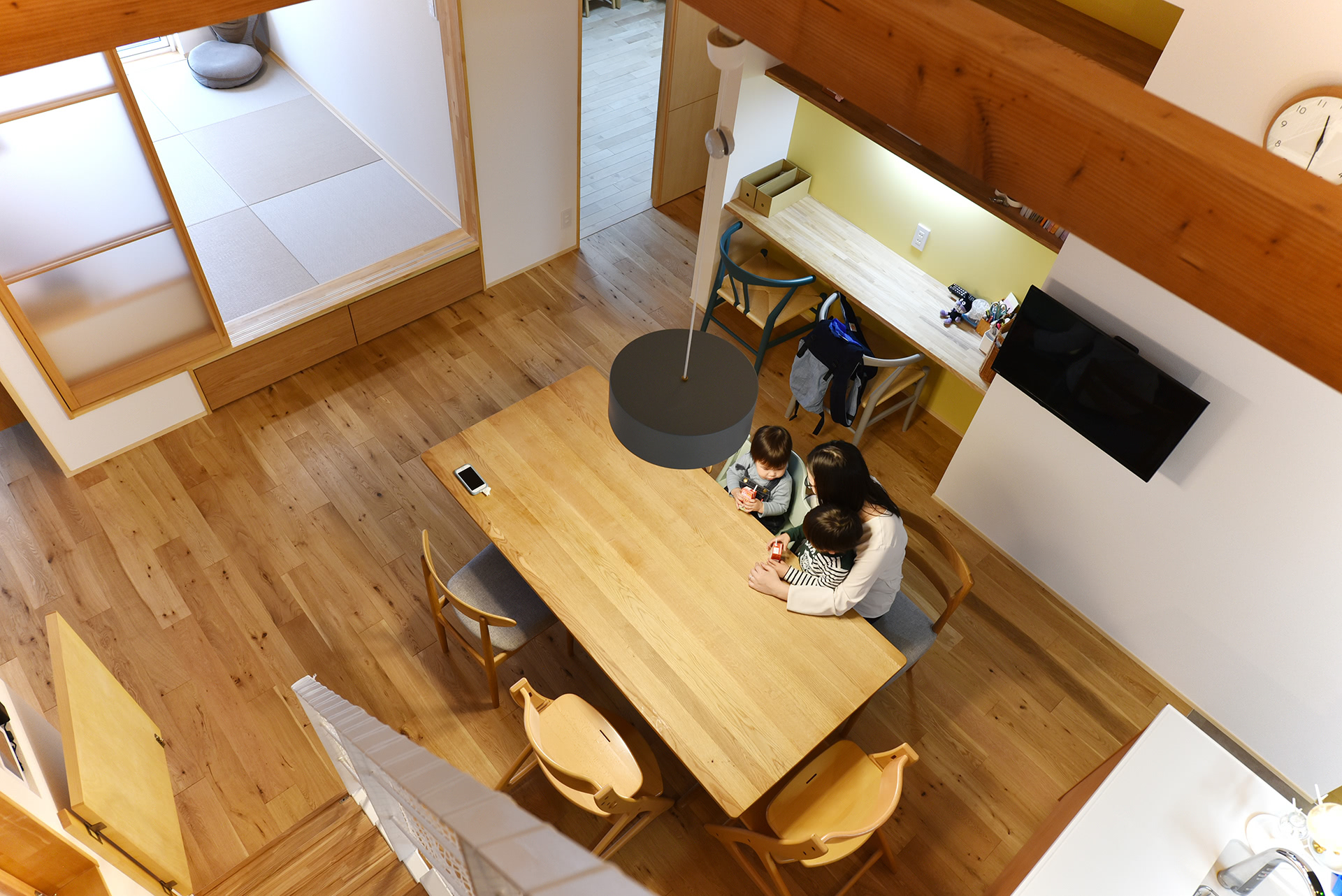 ダイニングキッチンから臨む。左からリビング→和室→子供部屋。ダイニングテーブルの横にスタディスペース。台所からの子どもたちの視認性が抜群。