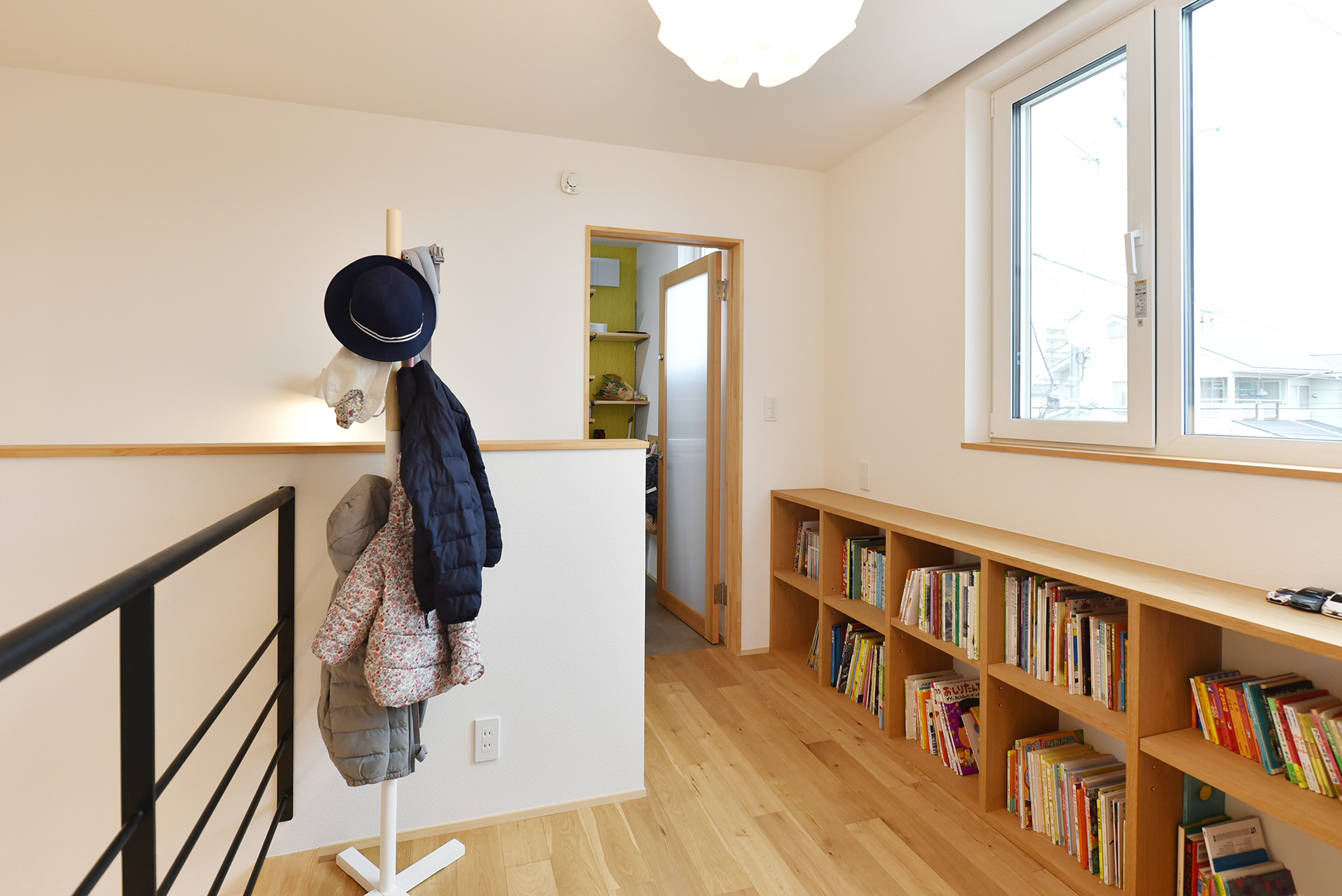 階段を上がると本棚の左右に扉があります。こちらに見えるのはキッチンに続く扉。反対側にはリビングに続く扉があり、ここでプライベートとパブリックの2方向に動線が分かれます。