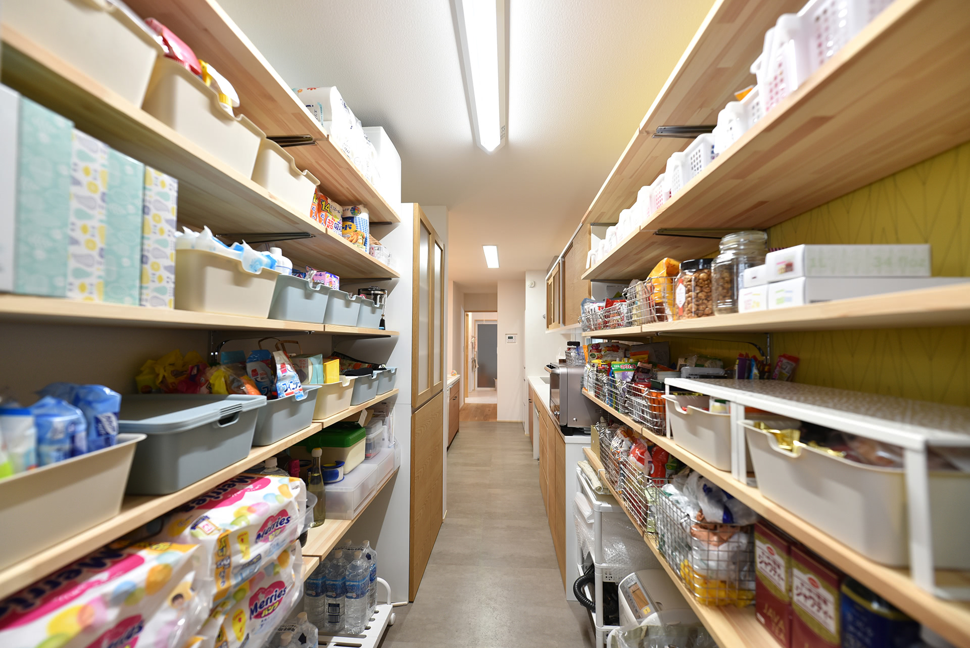 階段上の先程のプライベート扉から入ると・・・圧巻の一直線家事動線。大容量パントリー→キッチン→サニタリー→バスルーム