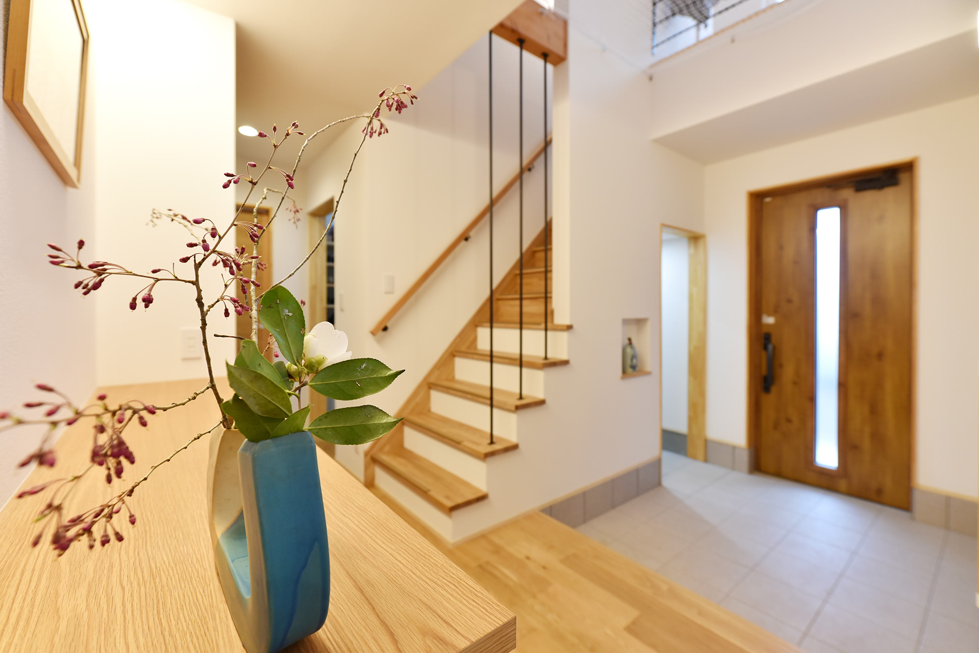 共用の玄関は2階まで吹き抜け。間接照明で飾り台を照らします。
