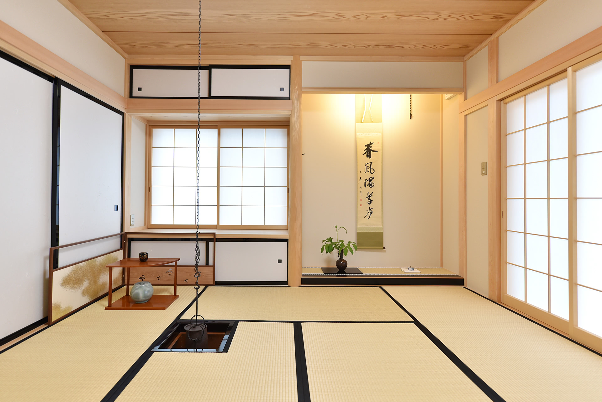 茶道師範のお母様の茶室。季節の花、掛け軸、棗(なつめ)等を設えて迎えてくださいました。水屋と納戸も備えた本格茶室です。