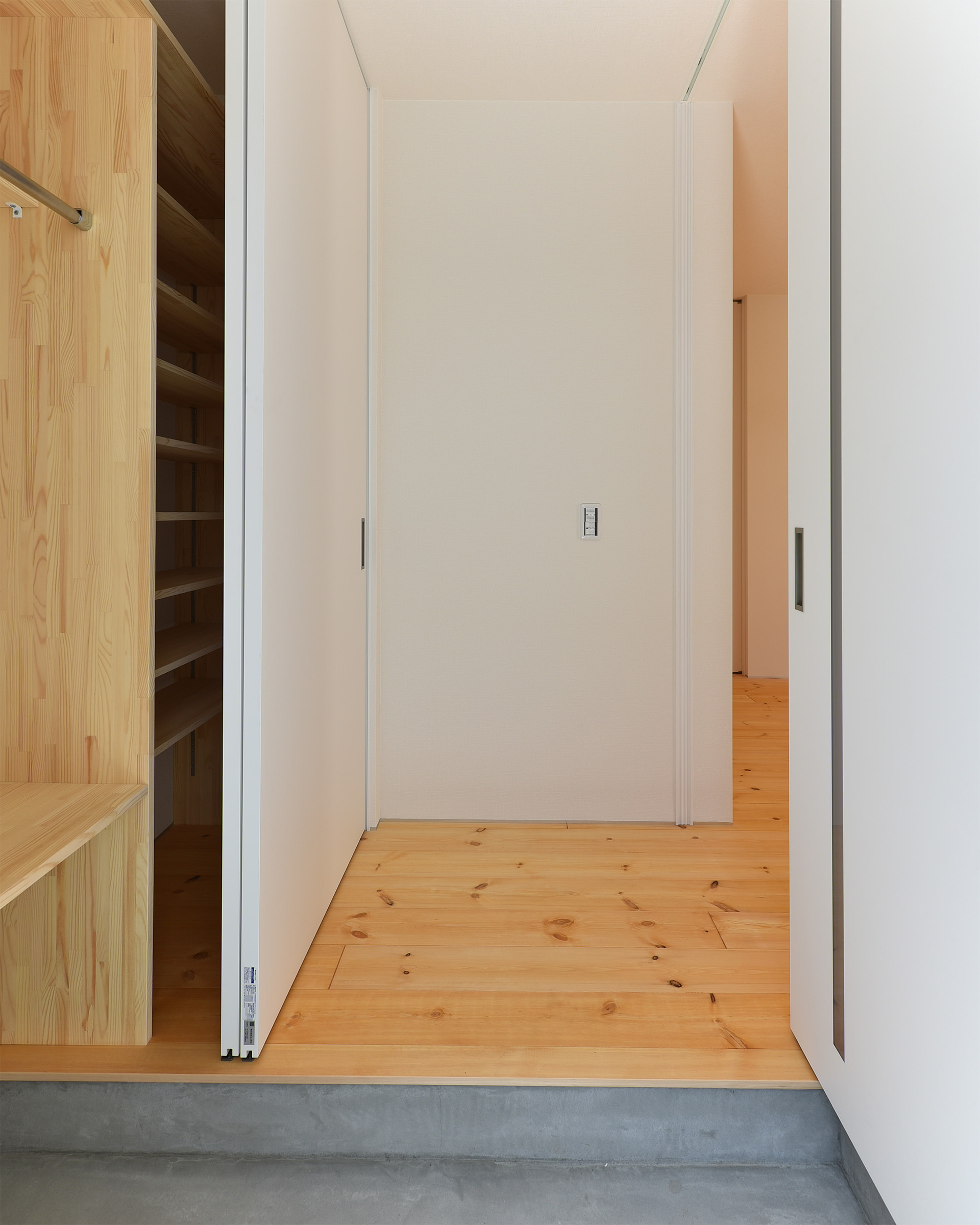 玄関からリビングに入ってすぐに3面棚のクローゼットを配置。ここに大きな収納があるとなにかと便利。