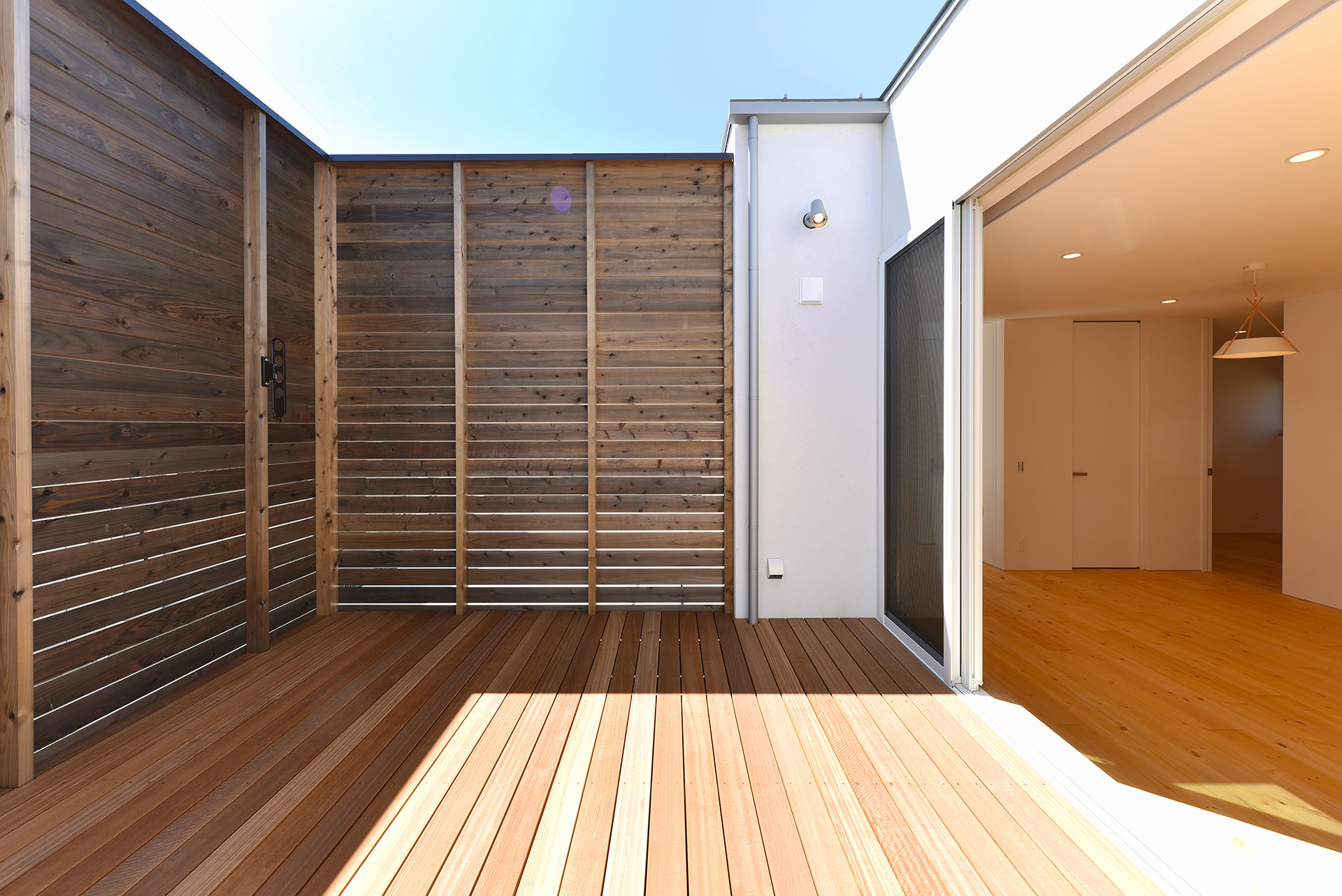 耐候性のある木材ウリンを貼ったテラス空間はこの通り青空へ突き抜けます。