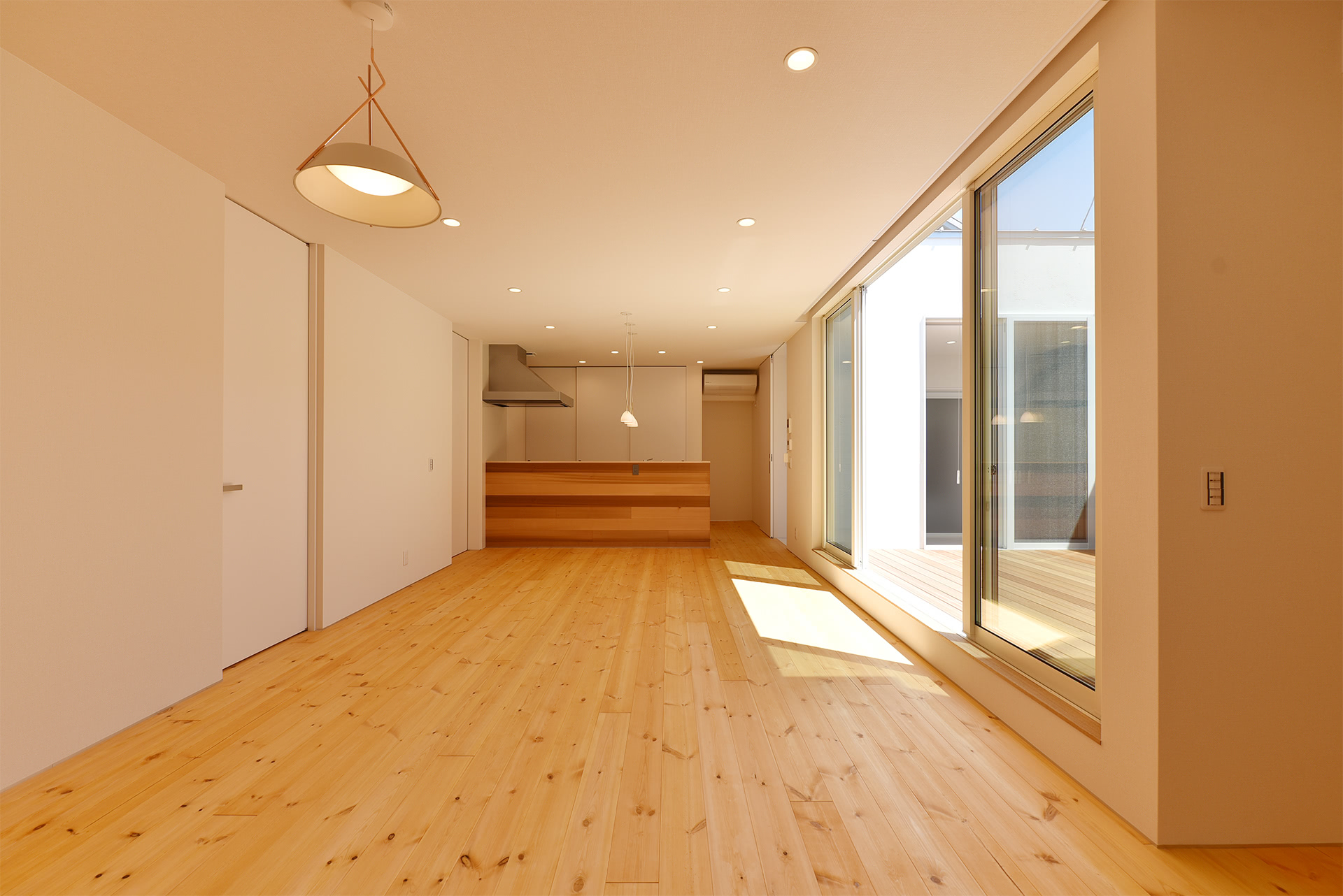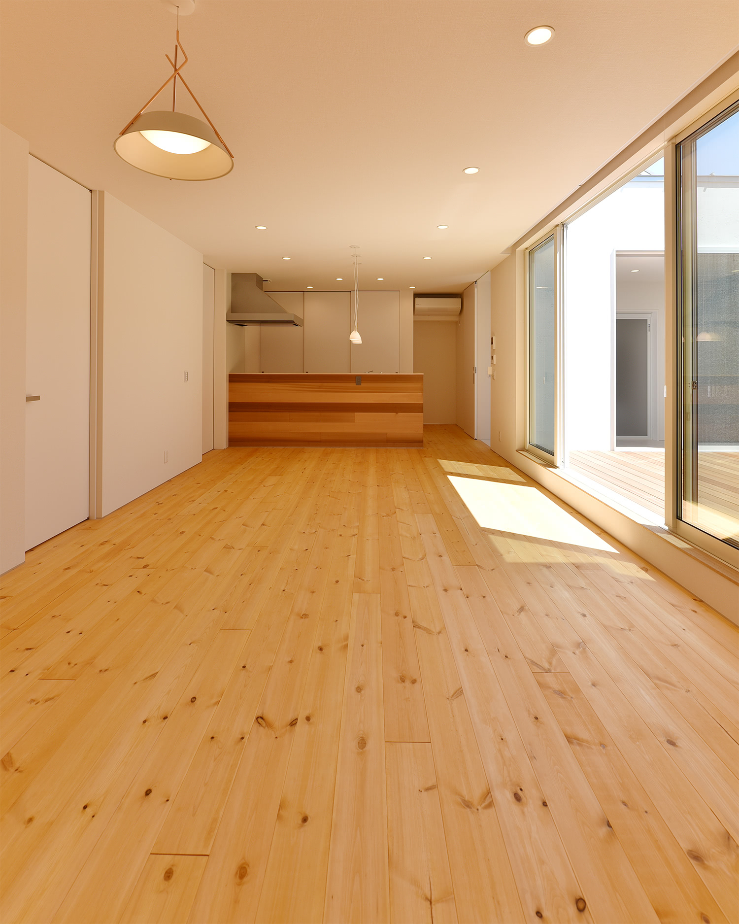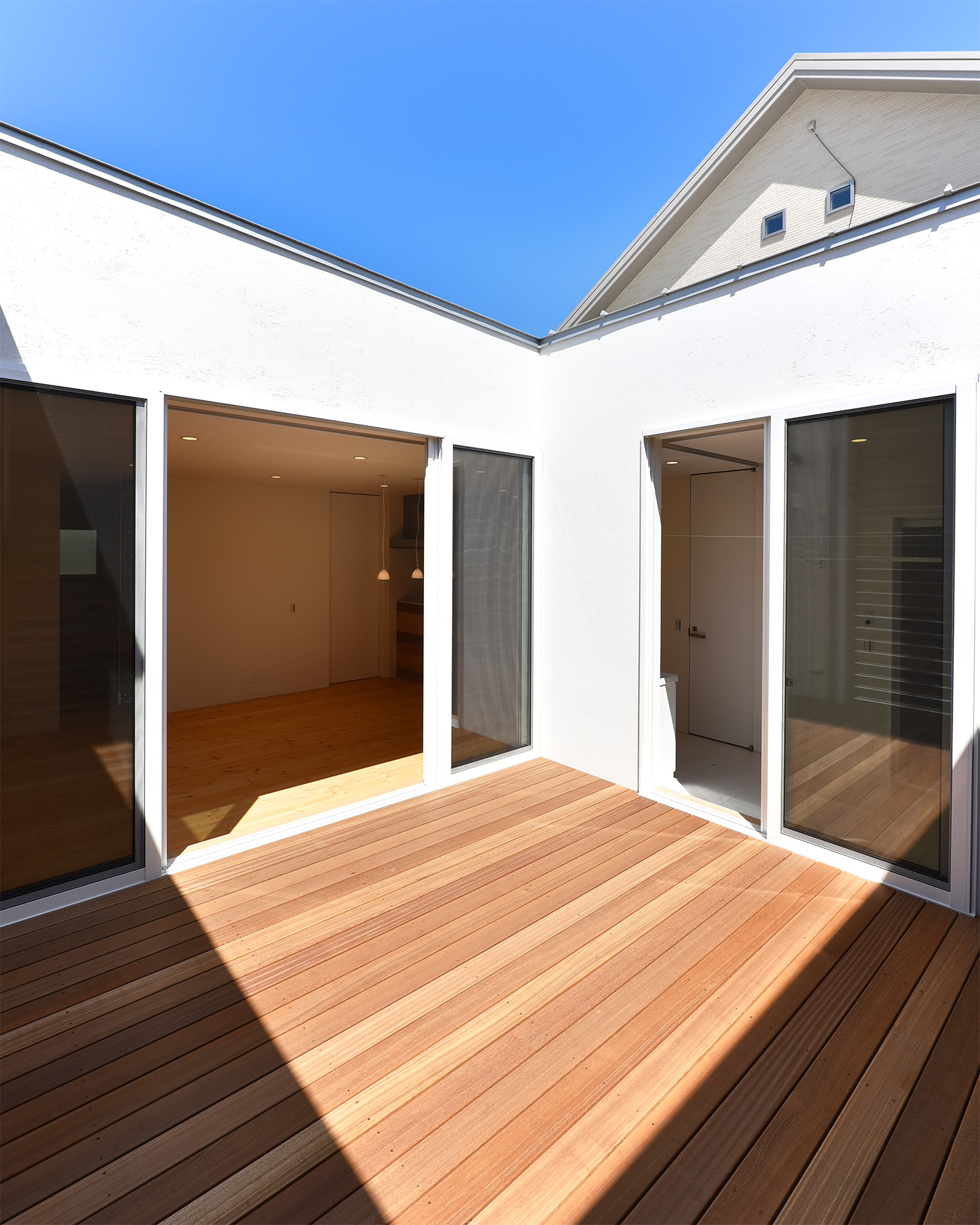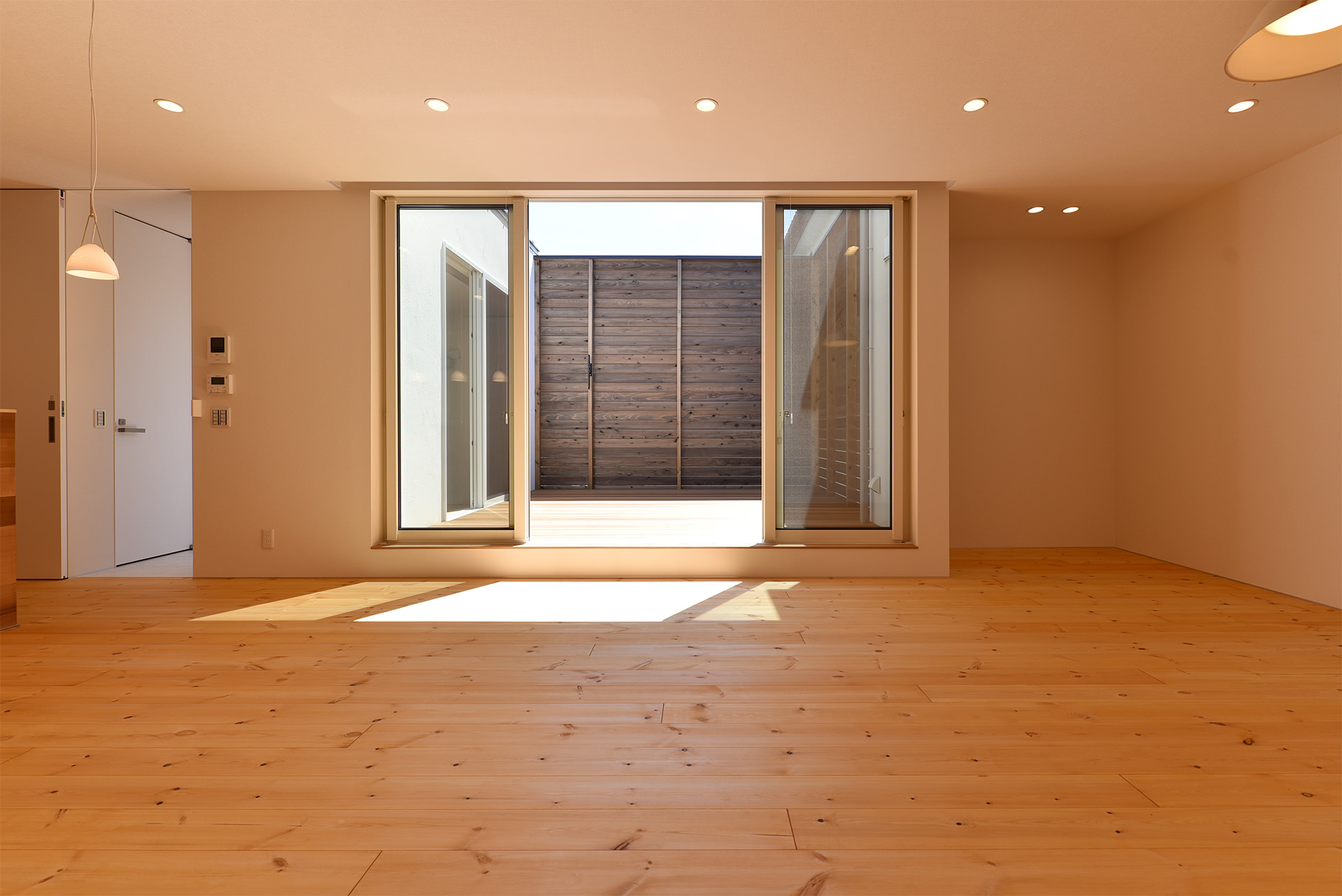 「試しに、『こういう考え方もできるですが』とこのスタイルを提案してみました。住宅街の奥まった敷地で前面に集会所があるので、プライベートを大事にしたいと考えました。外に閉じたように見える外観ですが、中はその分開放感を感じられるようなつくりになっています。外からの視線の入り方を計算して、カーテンをしなくてもどこからも見られないというか、外の方と視線が合わないようになっています。」と鐵専務。