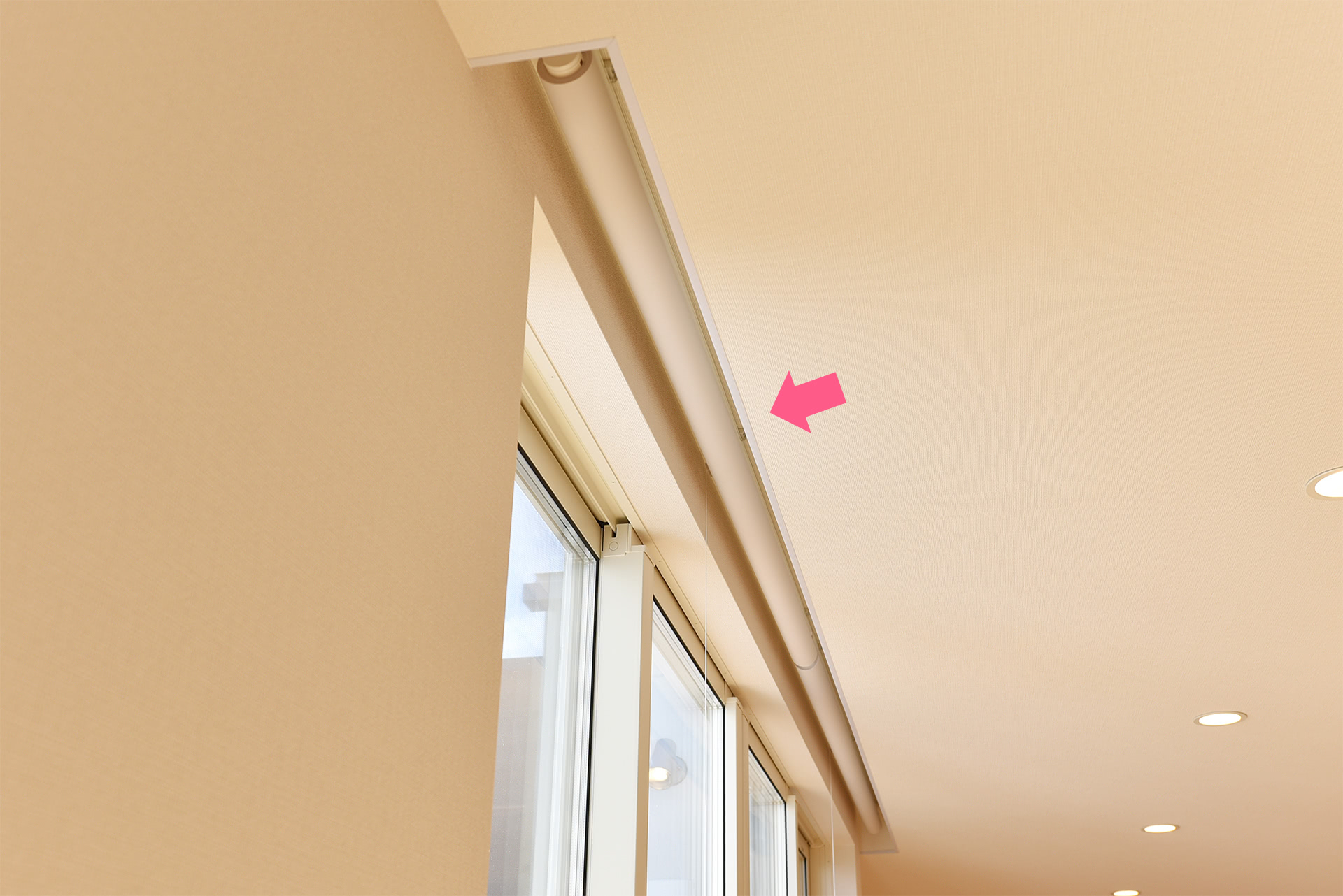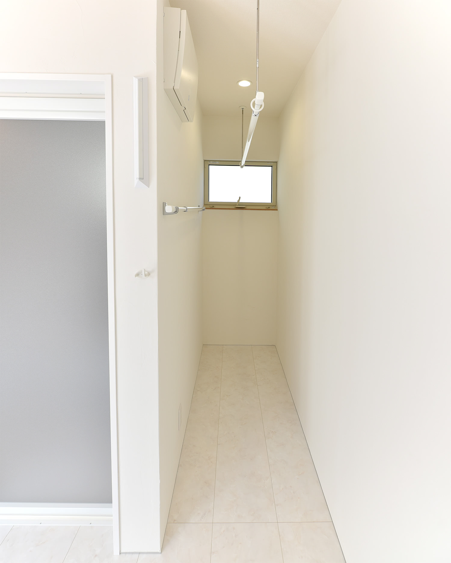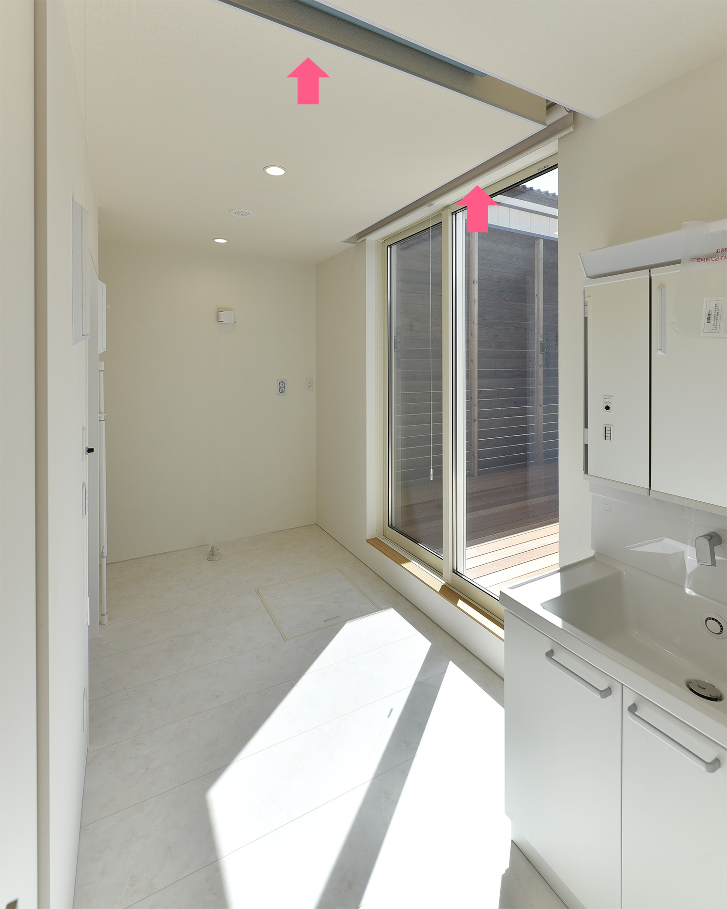 サニタリーにも。洗面とトイレまではお客様も使いますが、その先はこのロールスクリーンで適時仕切ります。
