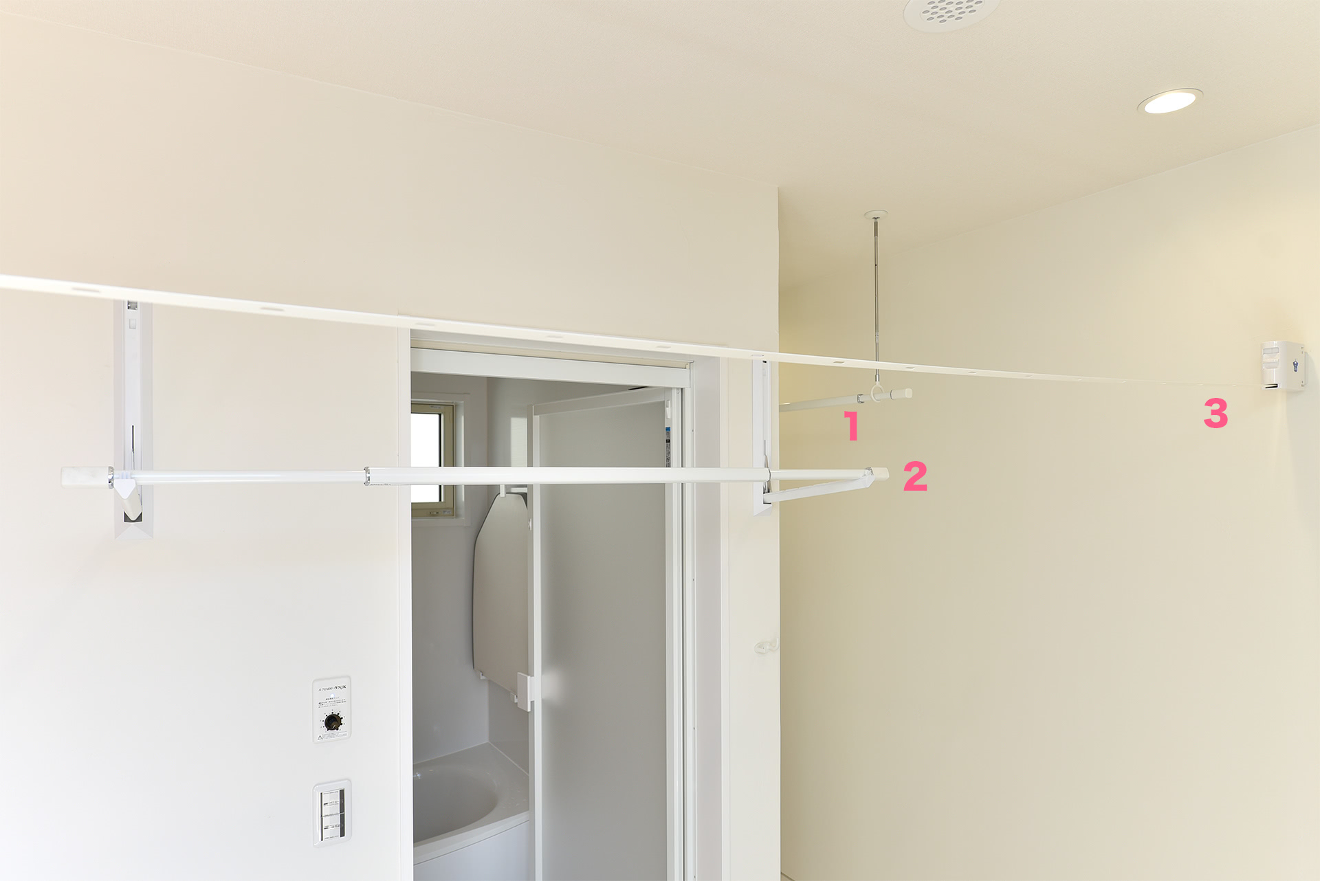 ハイパーランドリーシステムと呼びたい。共働きでも安心すぎる洗濯物干システム。3つのレーンがあります。1.はもう取り込まないでそのまま干しておきたいです。