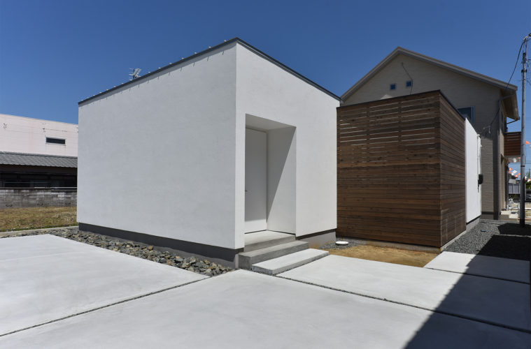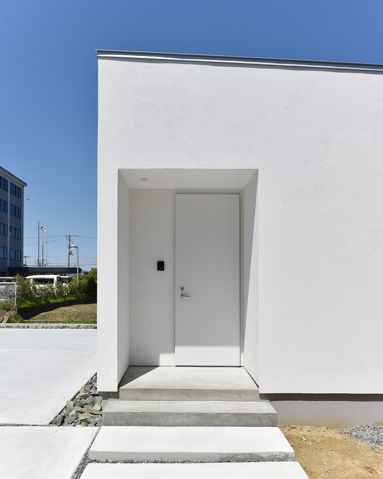 青い空、白い壁。映えまくっています。そして窓が一つも見当たりません。外構もコンクリートと石でどこまでもミニマル。(※後方の三角屋根は隣家です)