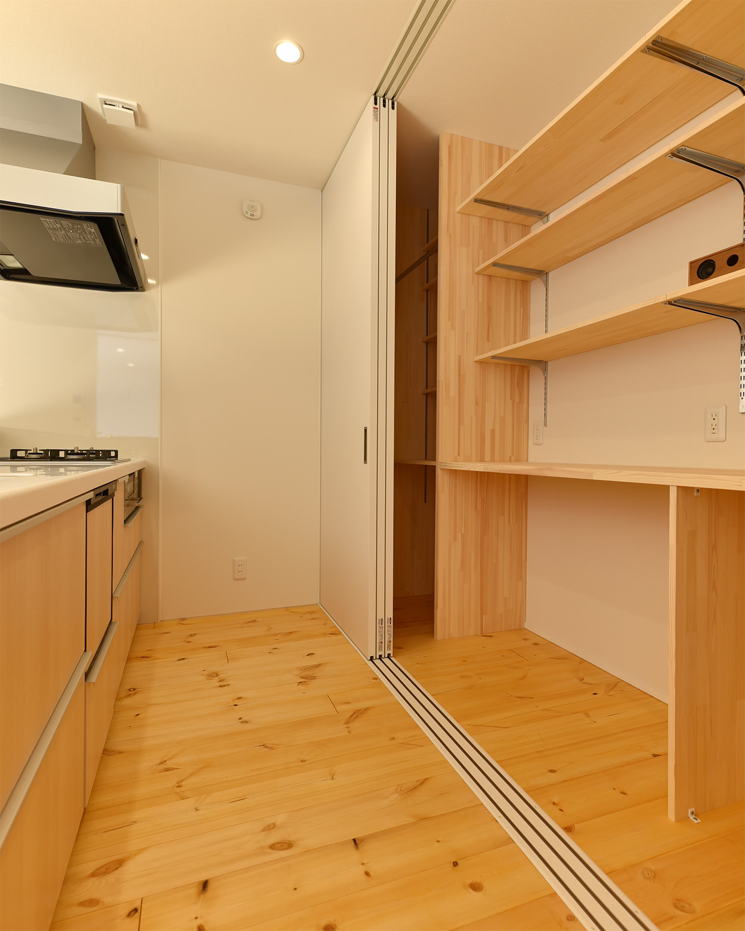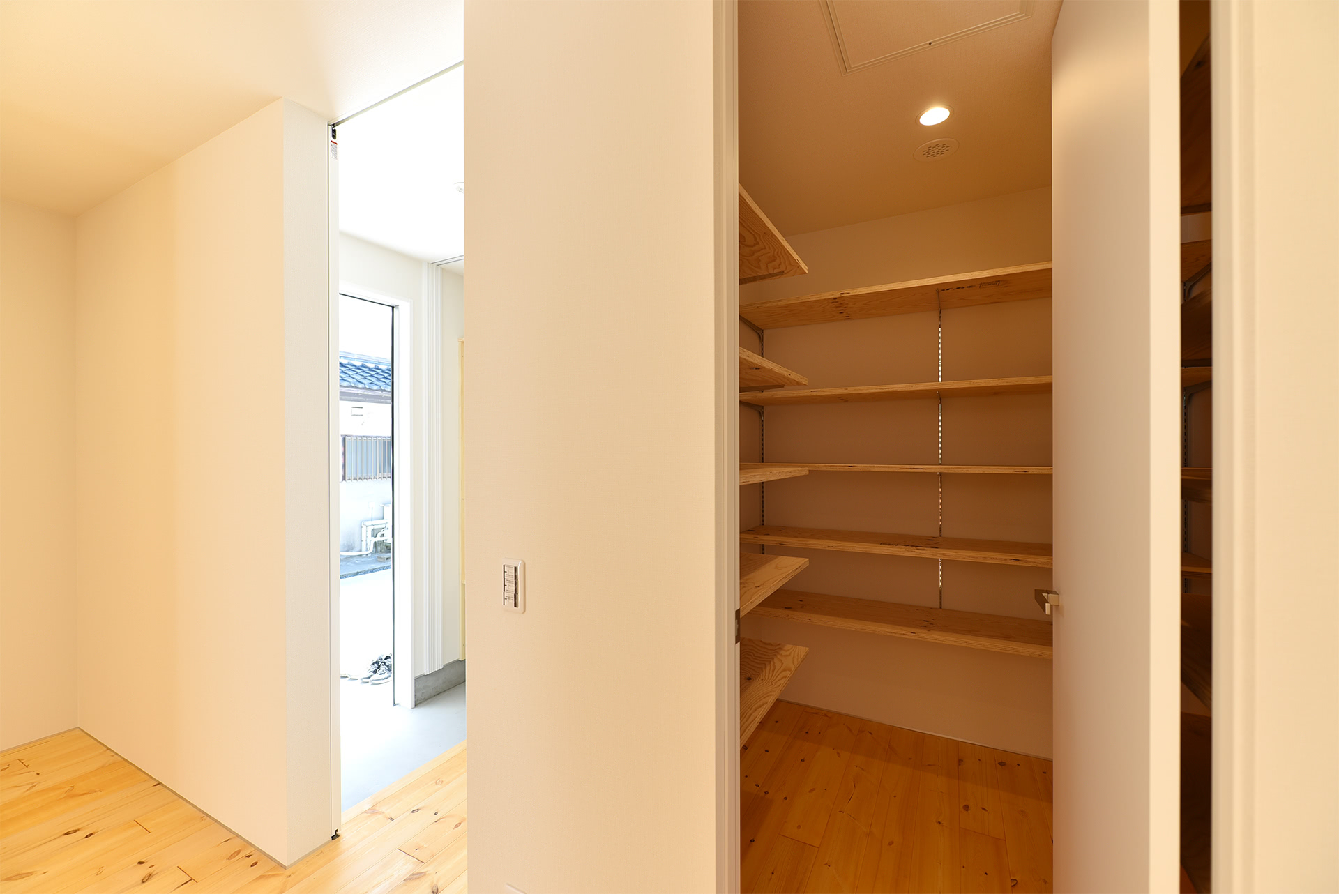 キッチンの後ろには大型収納。全部隠せることでLDKが乱雑にみえません。家電からの排気用に上部に換気扇もついています。