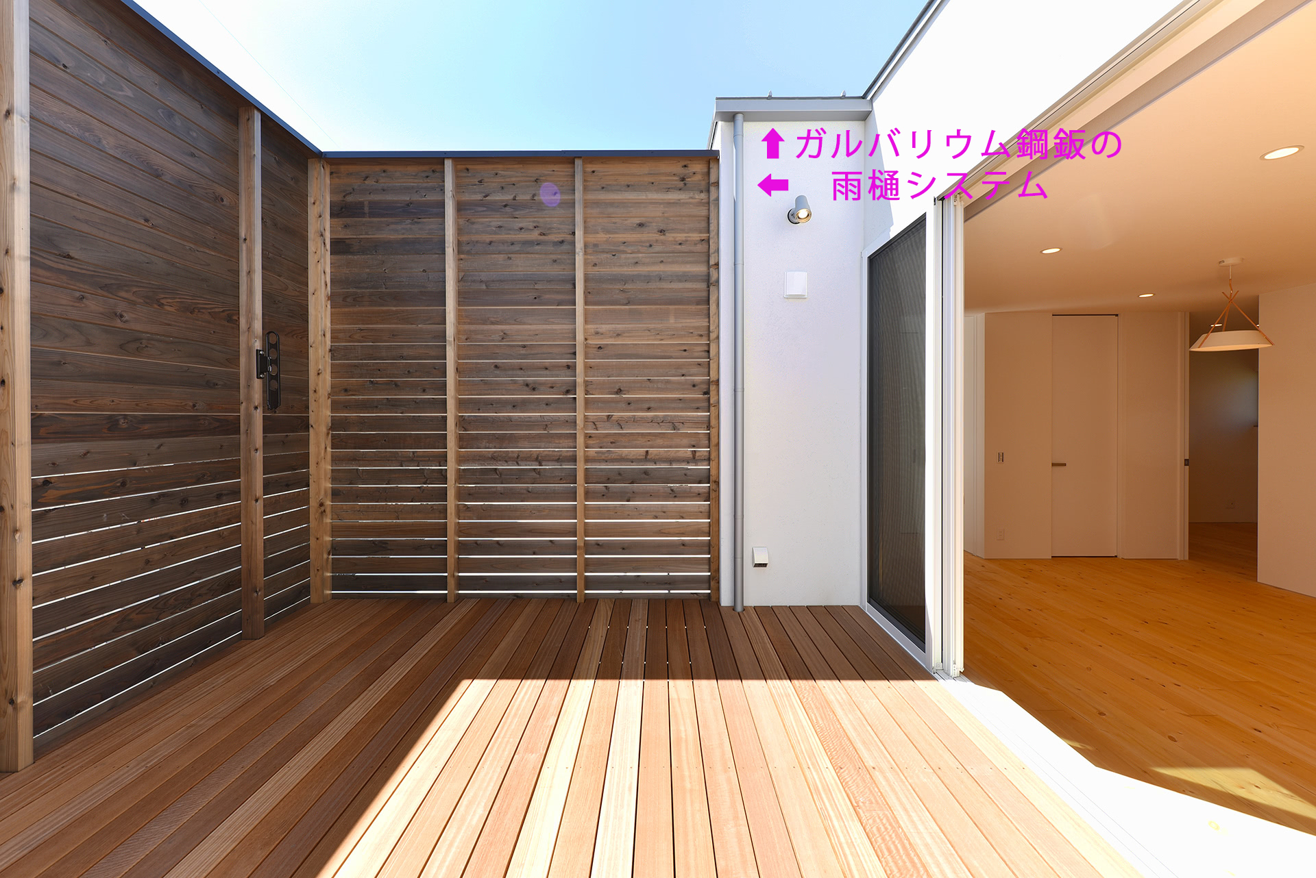「ガルバリウム鋼板の雨樋はスッキリおしゃれでかつ耐久性も高くおすすめ」とのこと。ウッドデッキの床下には出入り口を設けてあるので、タイヤや荷物などを置いていただけます。