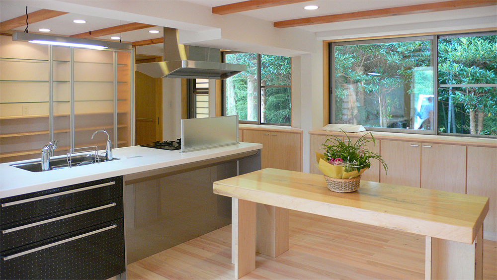 北側の雑木林を効果的に取り入れた窓のあるダイニングキッチン。 一日を通し明るさが一定なので落ち着いたいい雰囲気。
