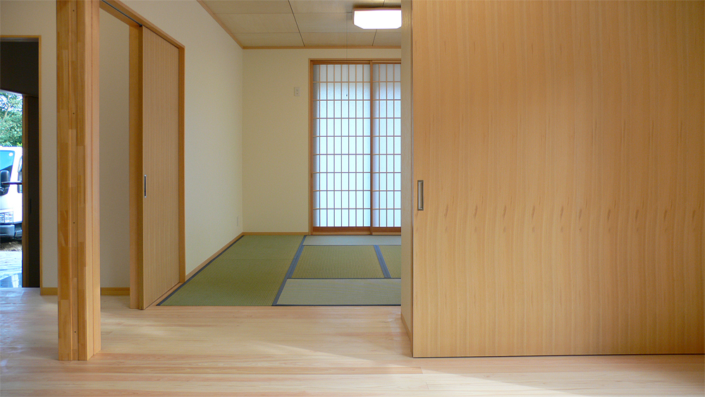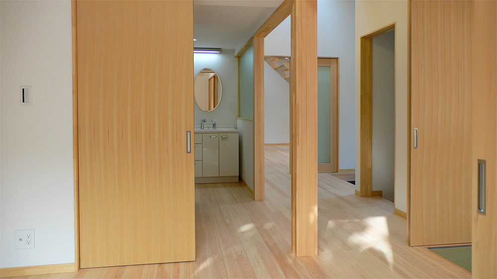 祖母の部屋は玄関から近く、トイレ・洗面・お風呂にも行きやすい動線。将来の介護も踏まえ引き戸も大きく。